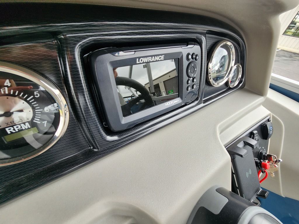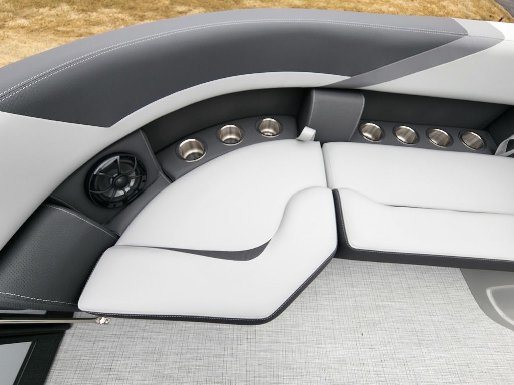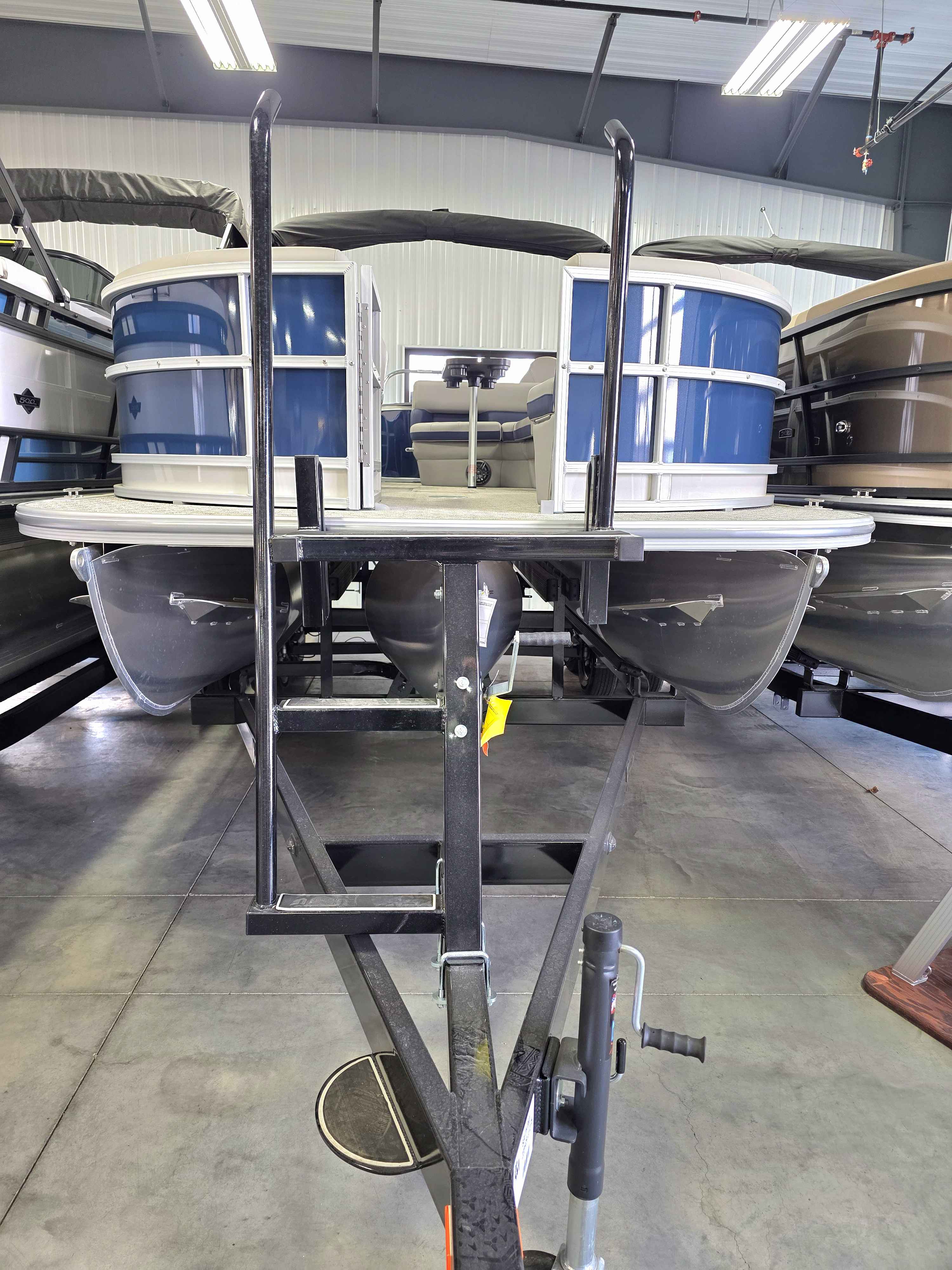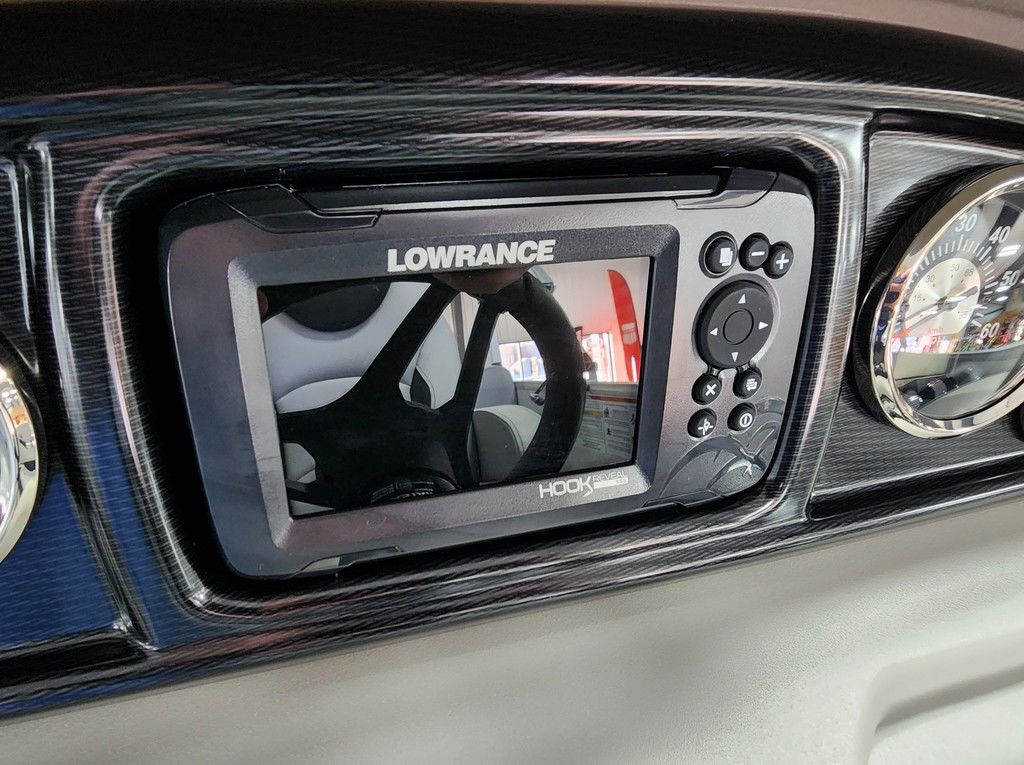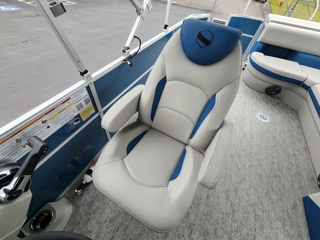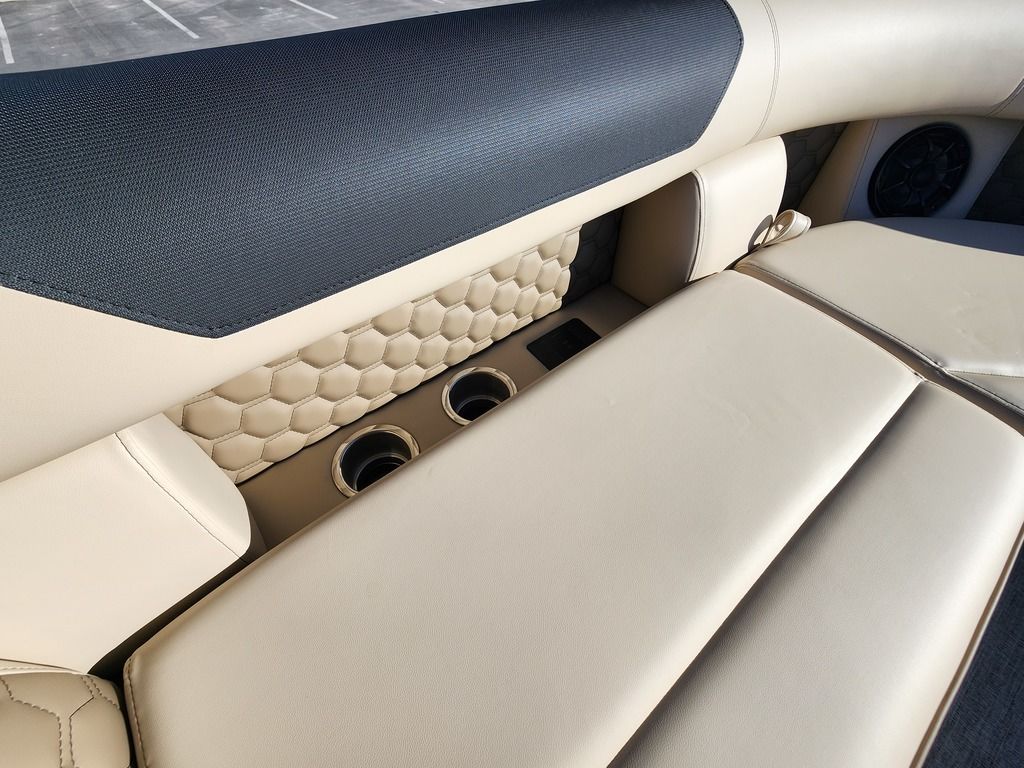 Exterior: Black Onyx and Navy Blue with Blackout Rail Package, Interior: Smoke TT and Navy Blue, Flooring: Titanium Standard, TriToon - Full Center Tube, In-Floor Storage, Power Electric Bimini, Mooring Cover in Coal, Lowrance Hook 5 Display, HD Folding Table, SS Ski Tow Bar, Trailer, and Many More Specs