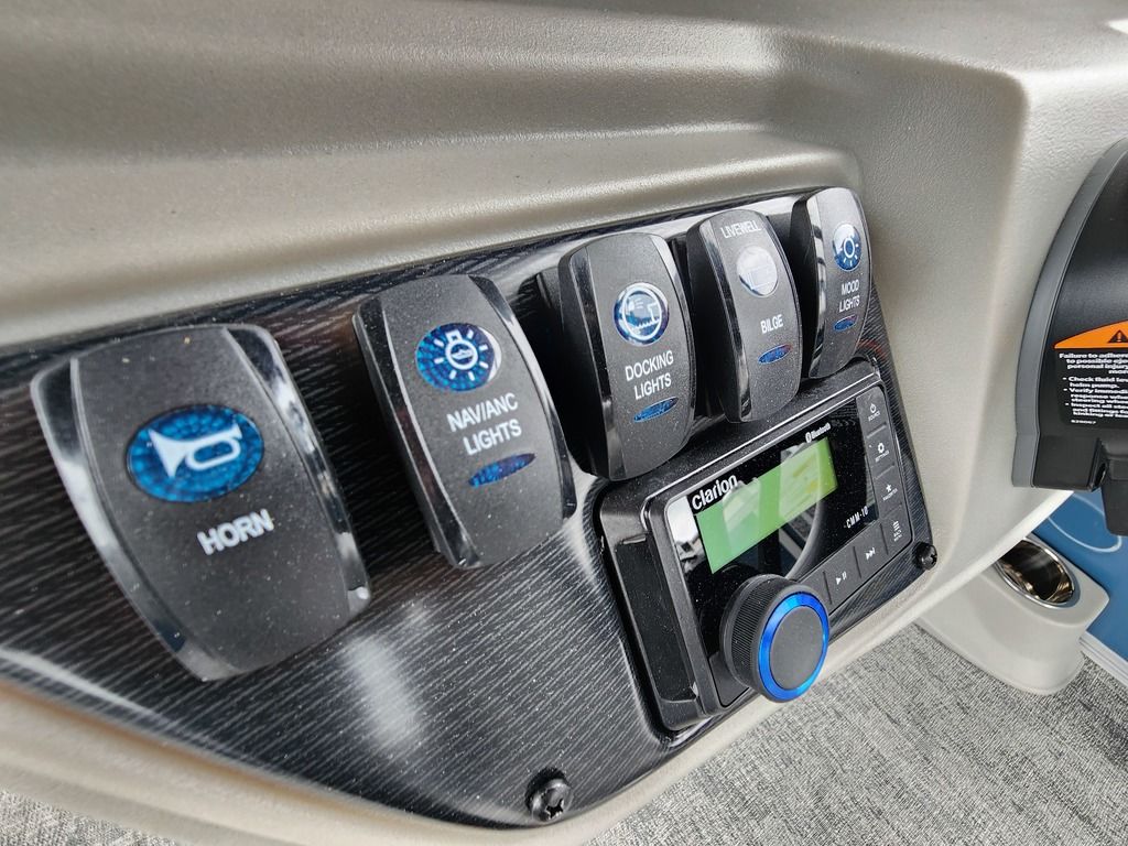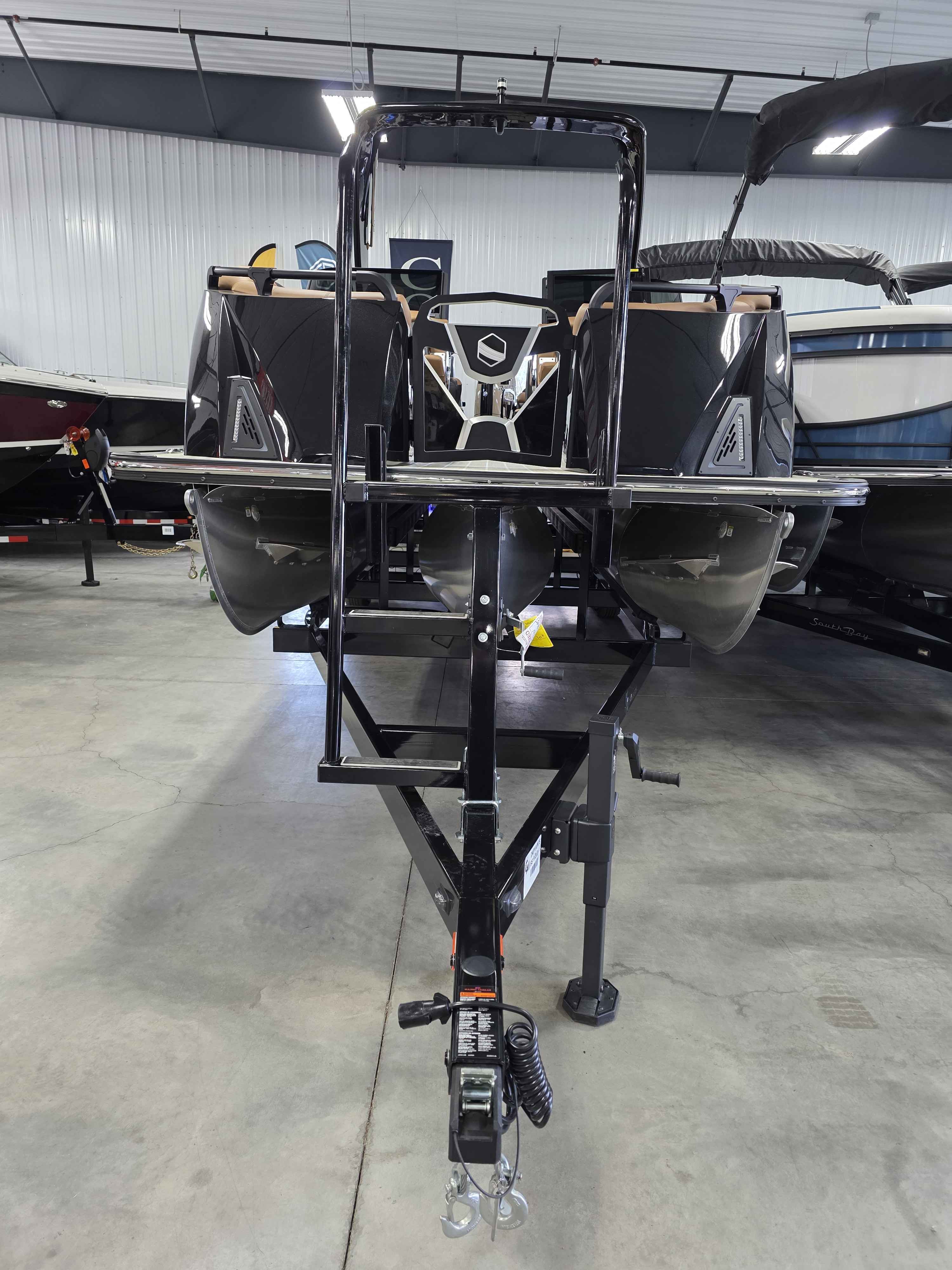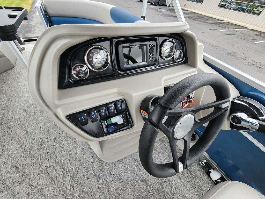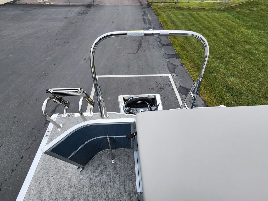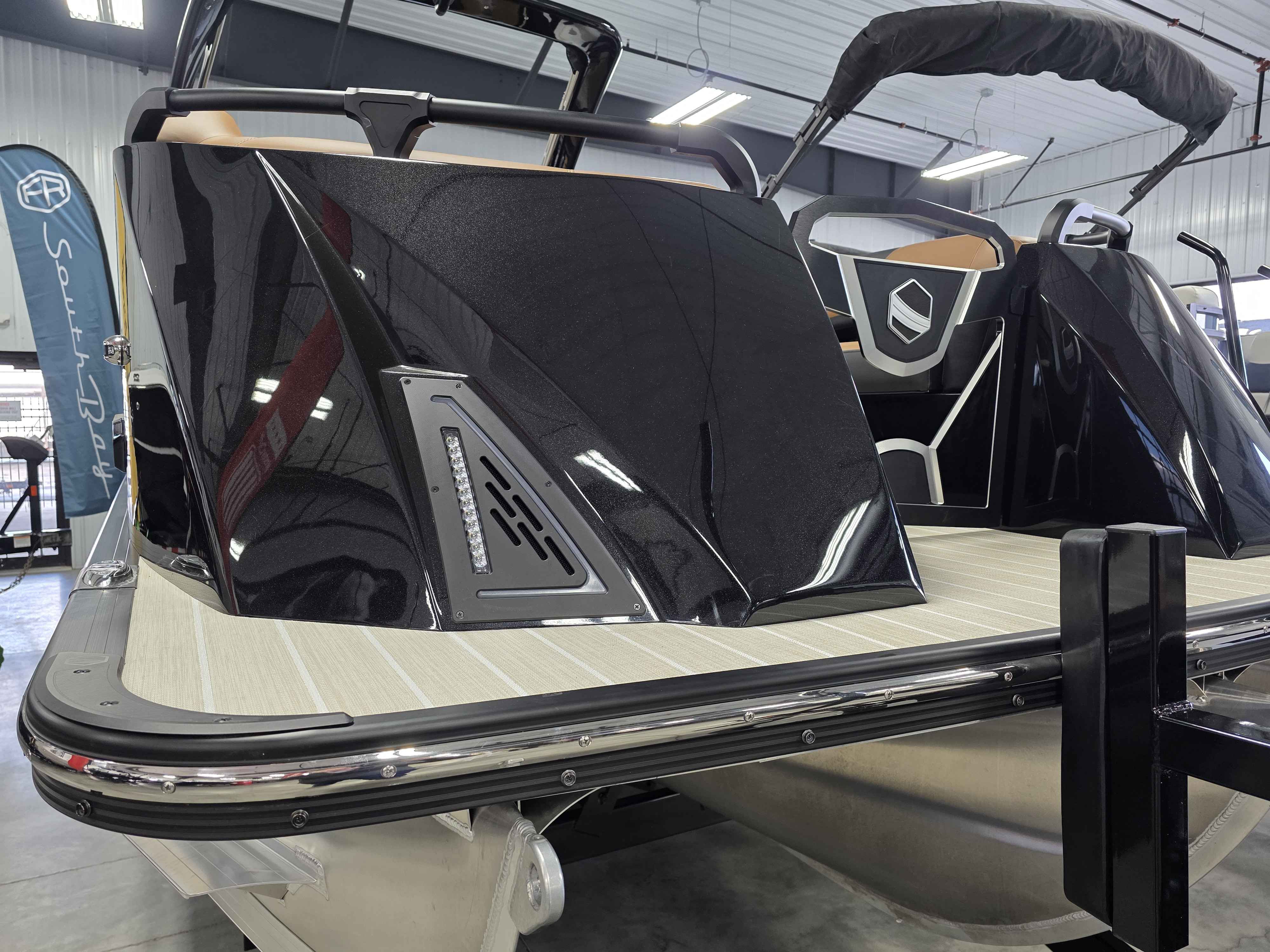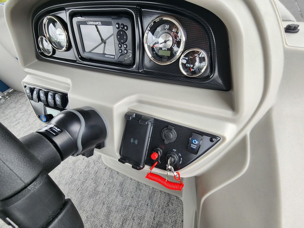 Exterior: Black Onyx and Navy Blue with Blackout Rail Package, Interior: Smoke TT and Navy Blue, Flooring: Titanium Standard, TriToon - Full Center Tube, In-Floor Storage, Power Electric Bimini, Mooring Cover in Coal, Lowrance Hook 5 Display, HD Folding Table, SS Ski Tow Bar, Trailer, and Many More Specs