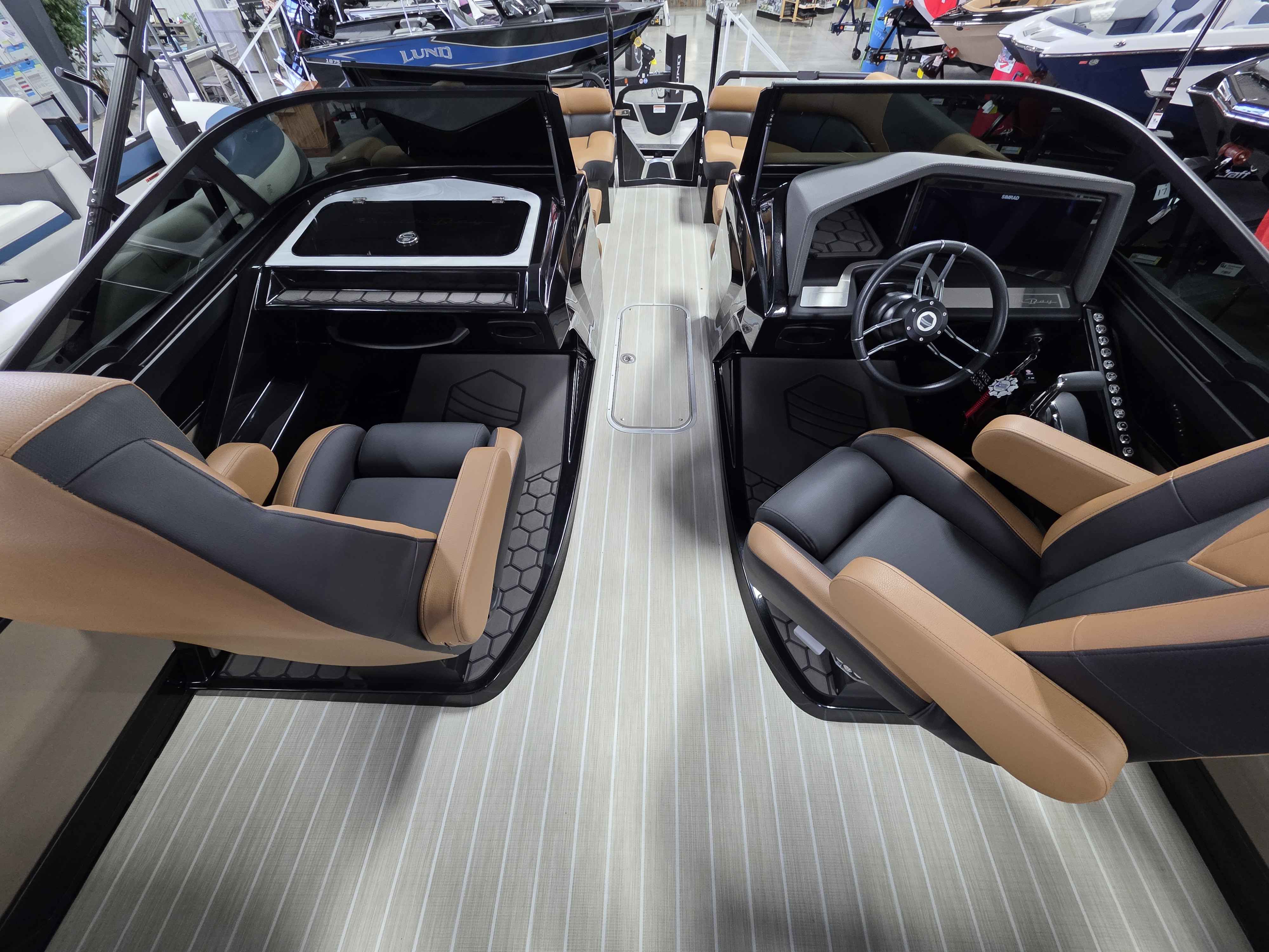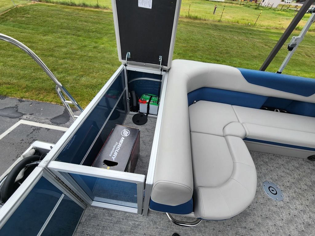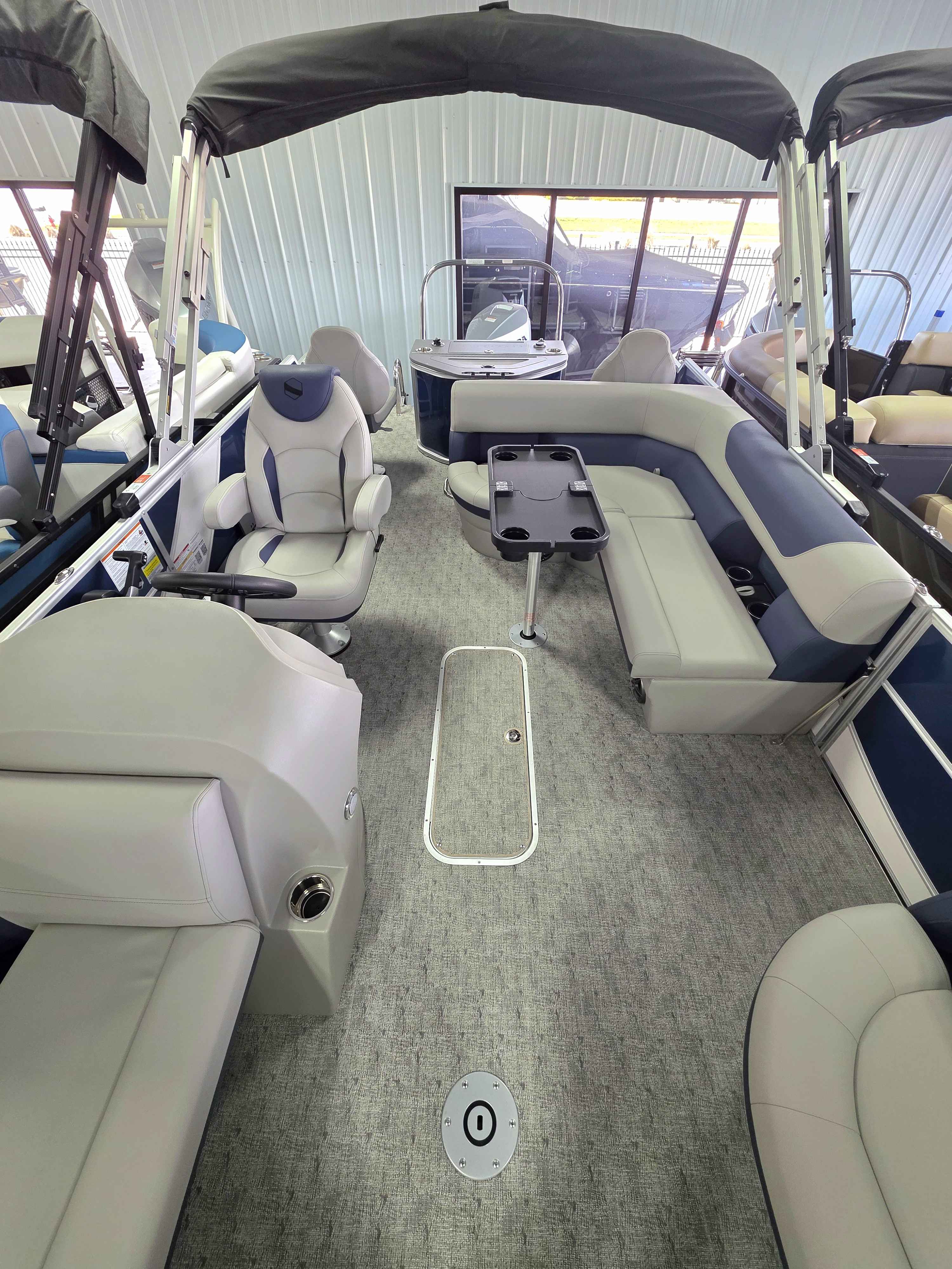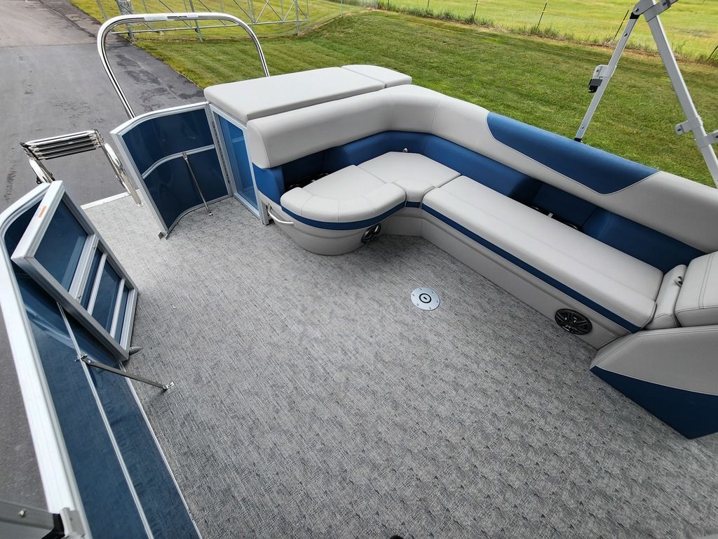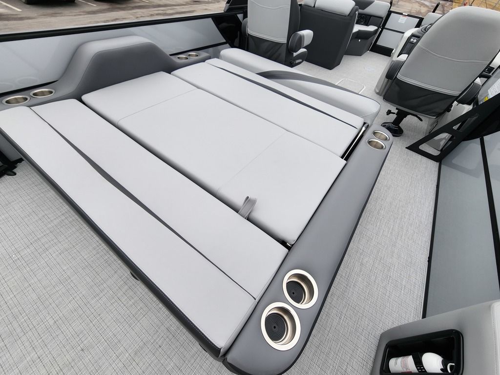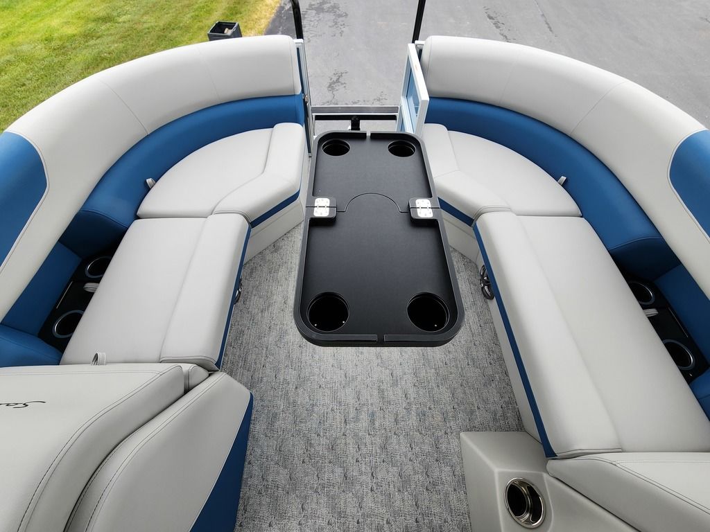 Exterior: Black Onyx and Navy Blue with Blackout Rail Package, Interior: Smoke TT and Navy Blue, Flooring: Titanium Standard, TriToon - Full Center Tube, In-Floor Storage, Power Electric Bimini, Mooring Cover in Coal, Lowrance Hook 5 Display, HD Folding Table, SS Ski Tow Bar, Trailer, and Many More Specs