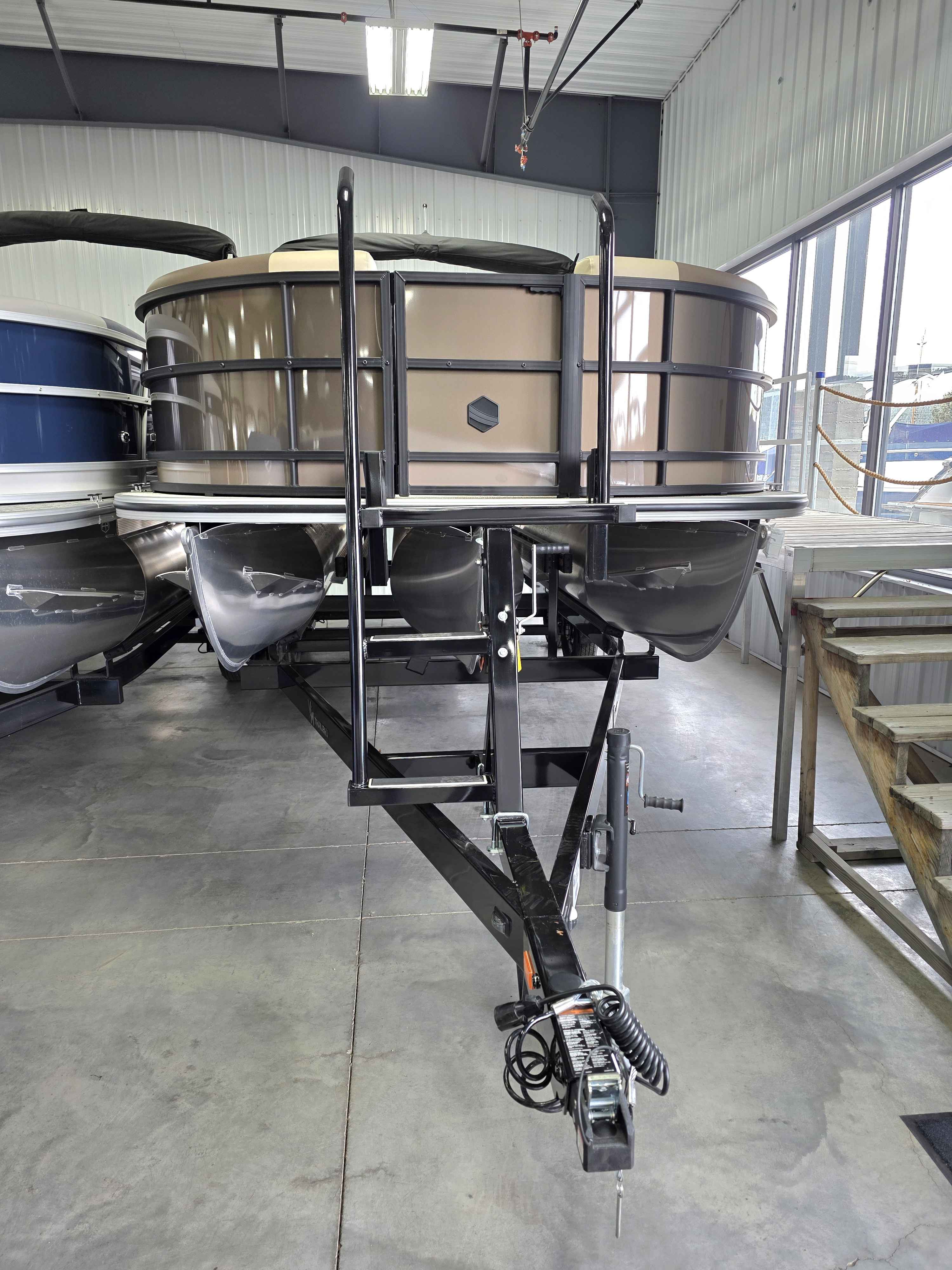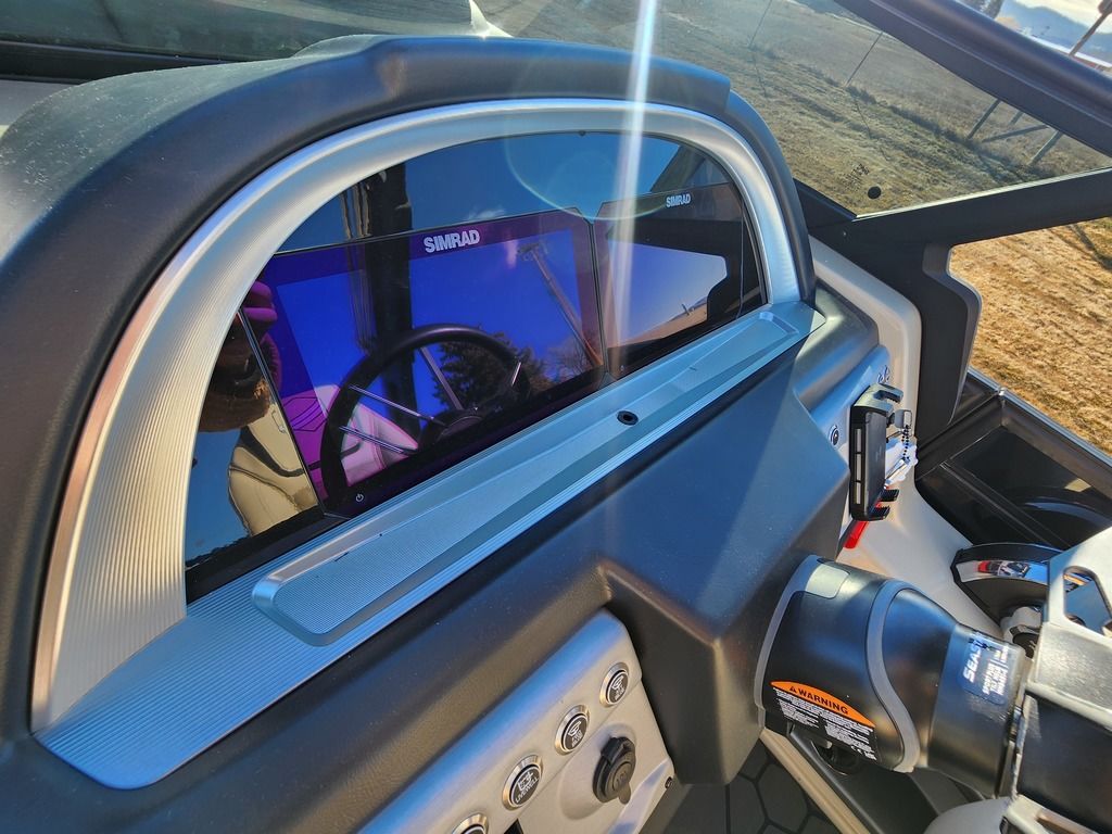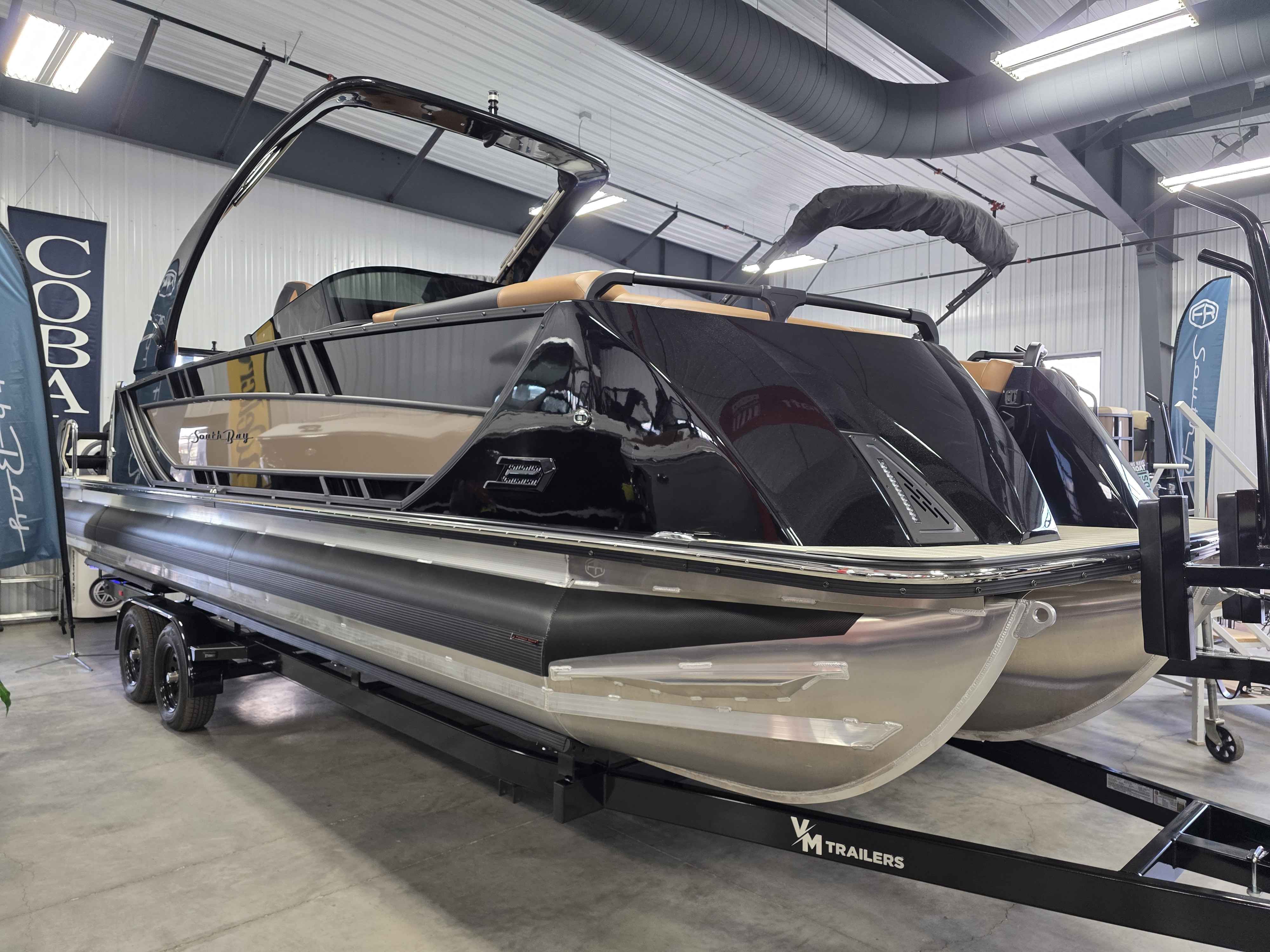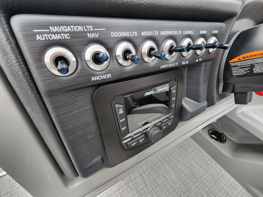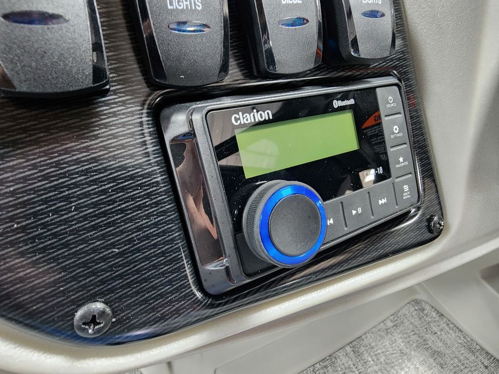 Exterior: Black Onyx and Navy Blue with Blackout Rail Package, Interior: Smoke TT and Navy Blue, Flooring: Titanium Standard, TriToon - Full Center Tube, In-Floor Storage, Power Electric Bimini, Mooring Cover in Coal, Lowrance Hook 5 Display, HD Folding Table, SS Ski Tow Bar, Trailer, and Many More Specs