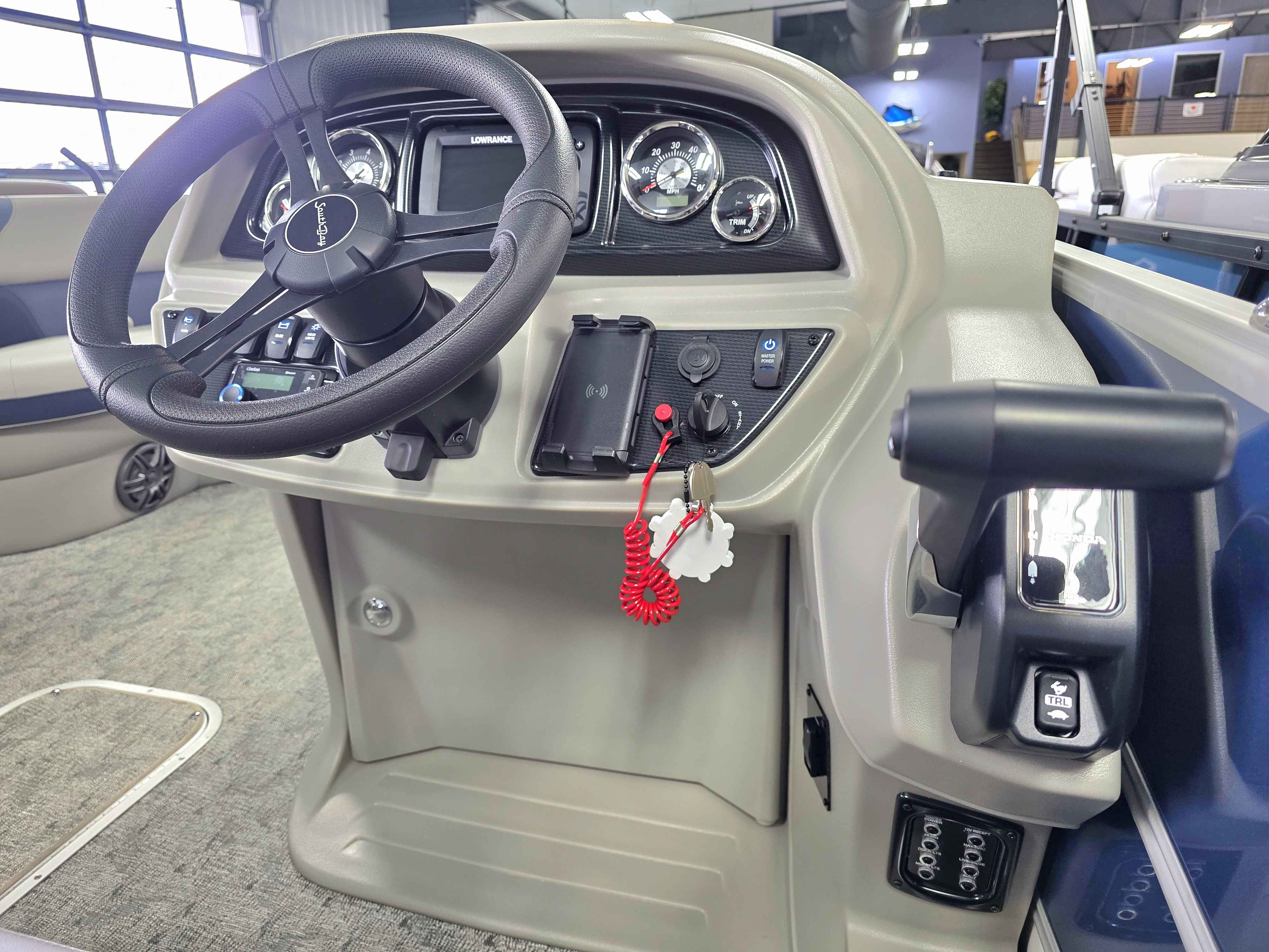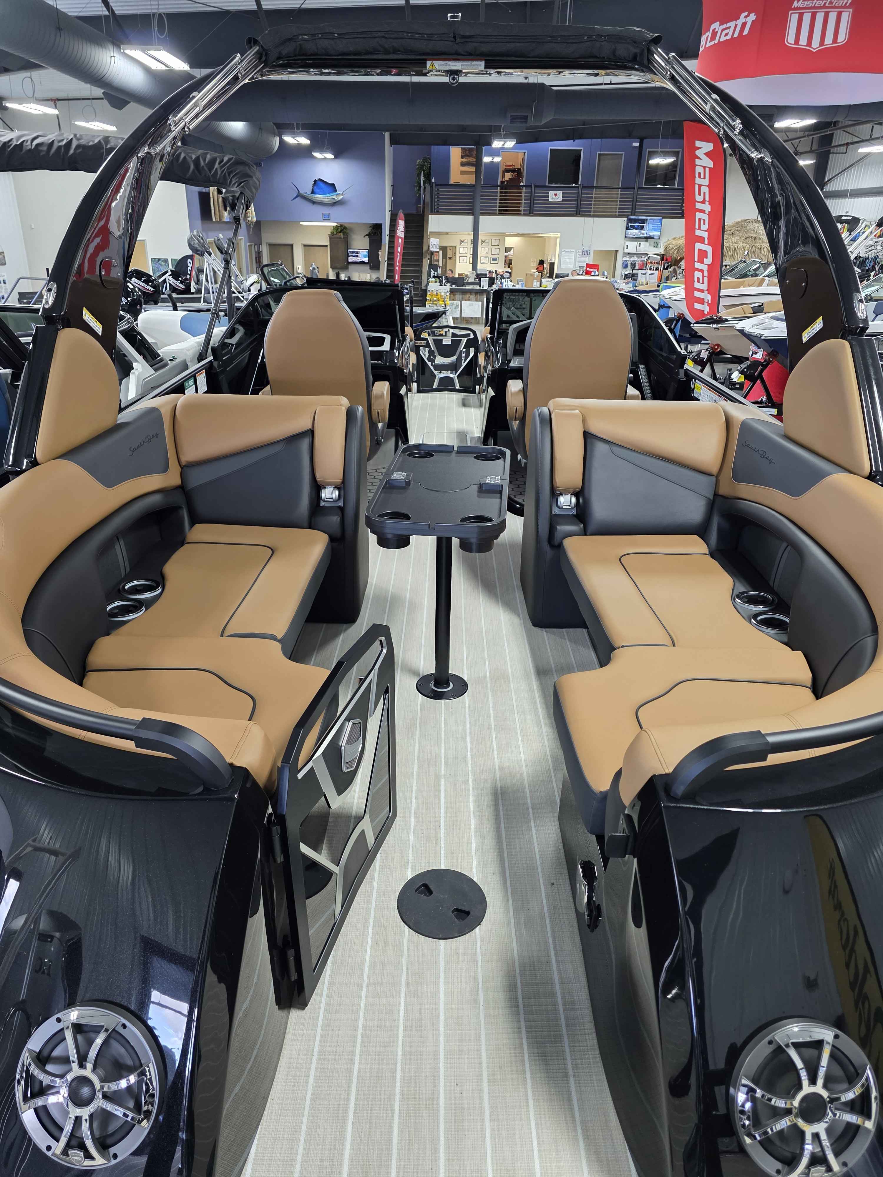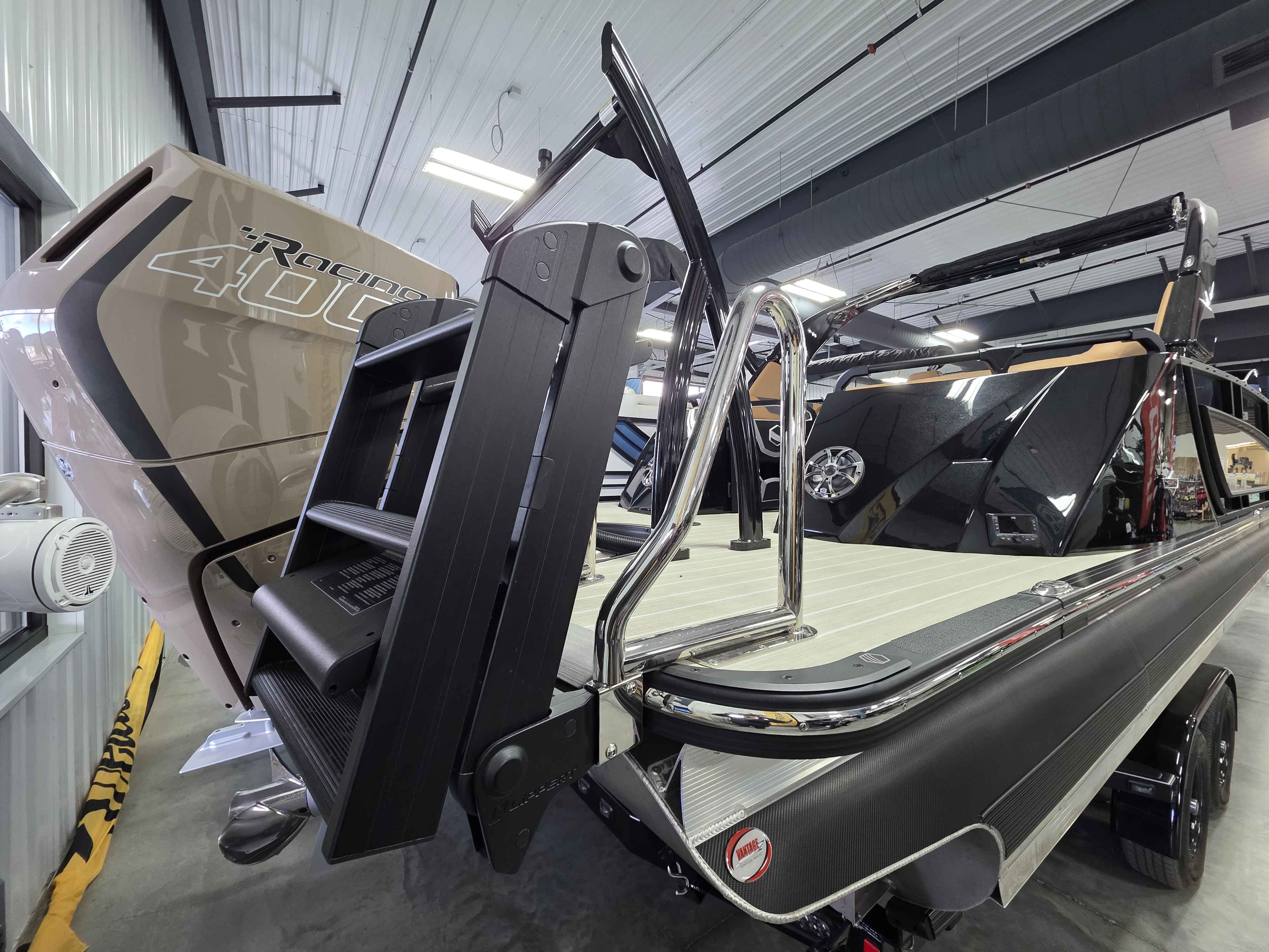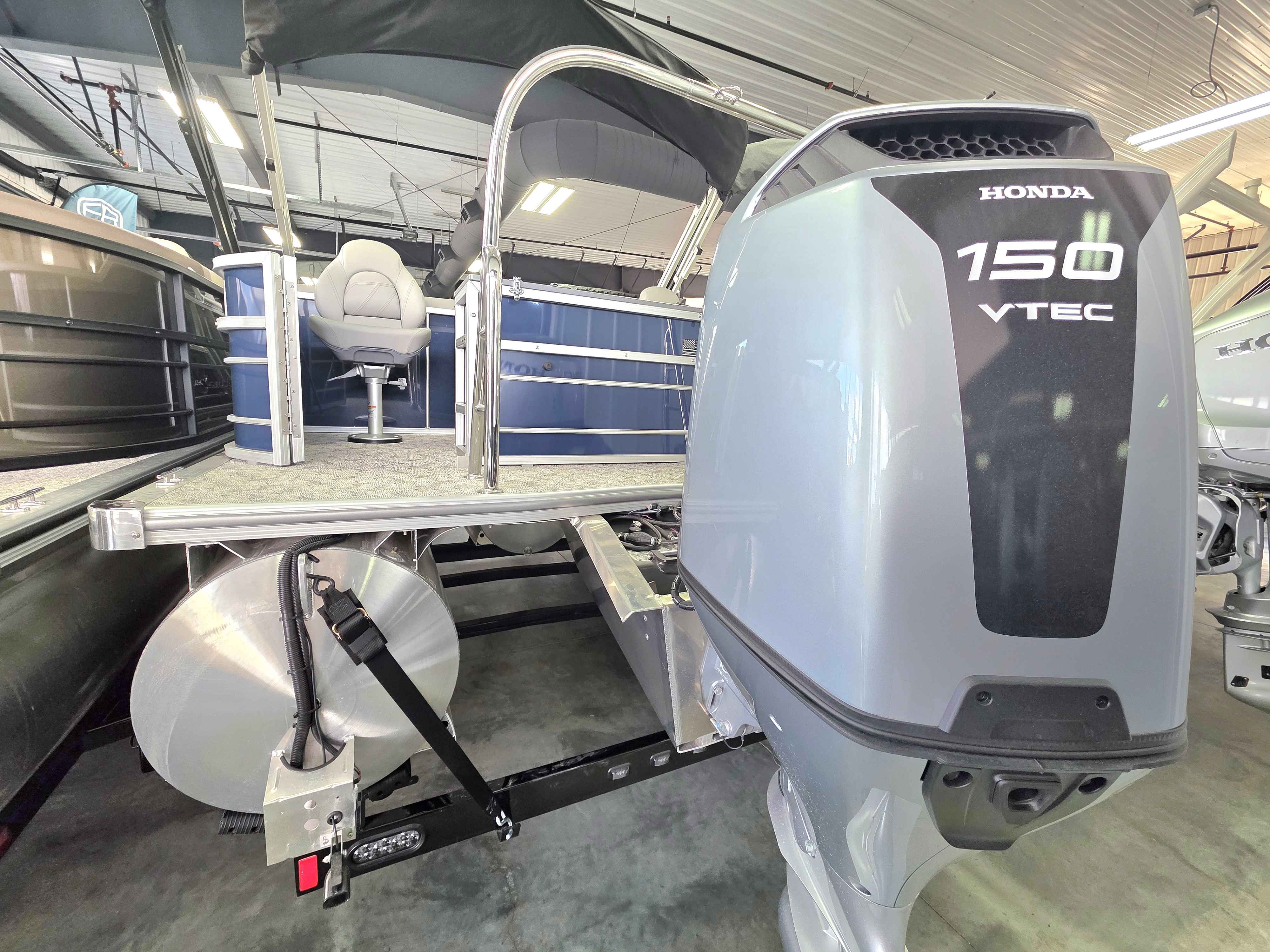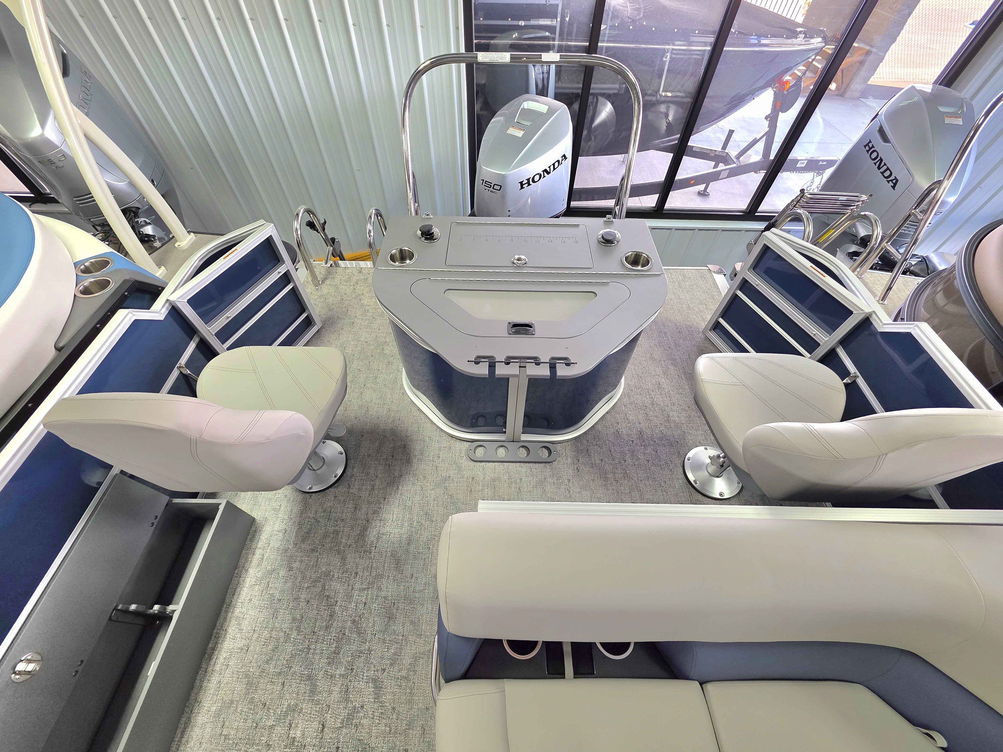 Exterior: Black Onyx and Navy Blue with Blackout Rail Package, Interior: Smoke TT and Navy Blue, Flooring: Titanium Standard, TriToon - Full Center Tube, In-Floor Storage, Power Electric Bimini, Mooring Cover in Coal, Lowrance Hook 5 Display, HD Folding Table, SS Ski Tow Bar, Trailer, and Many More Specs