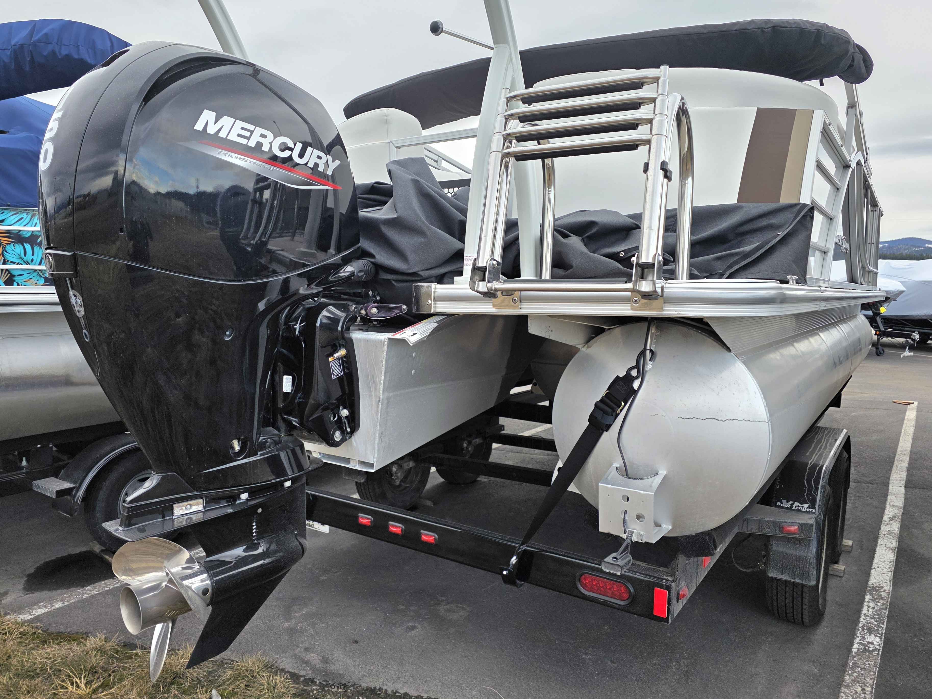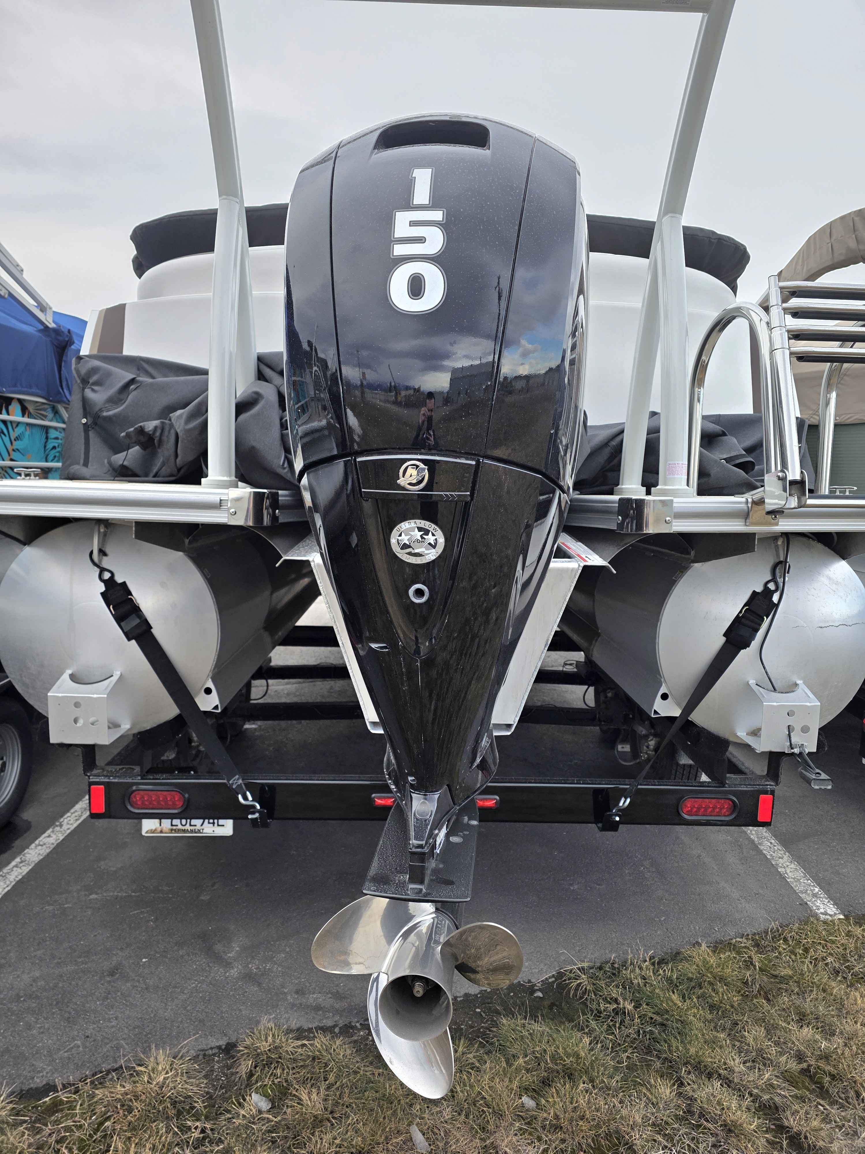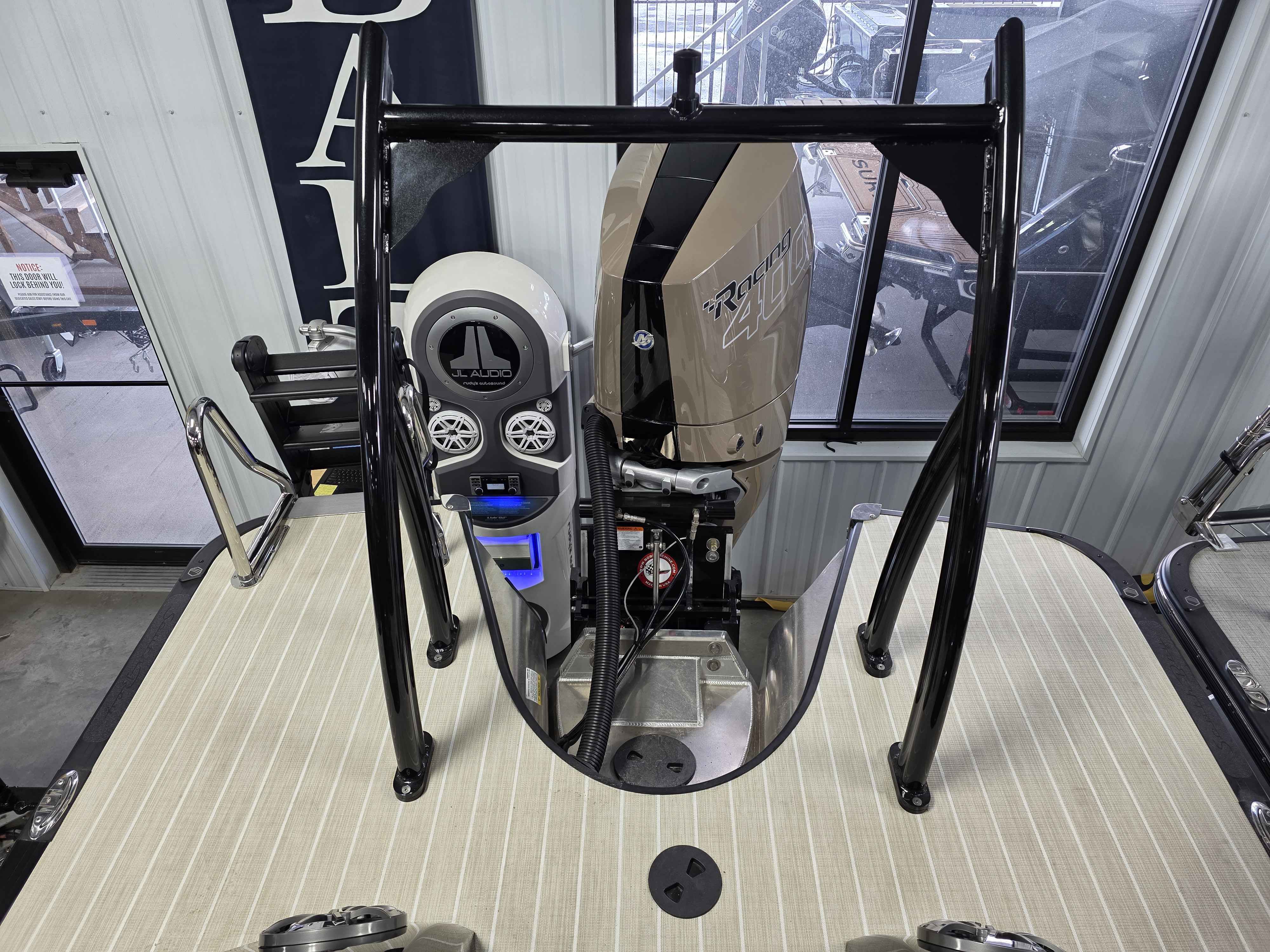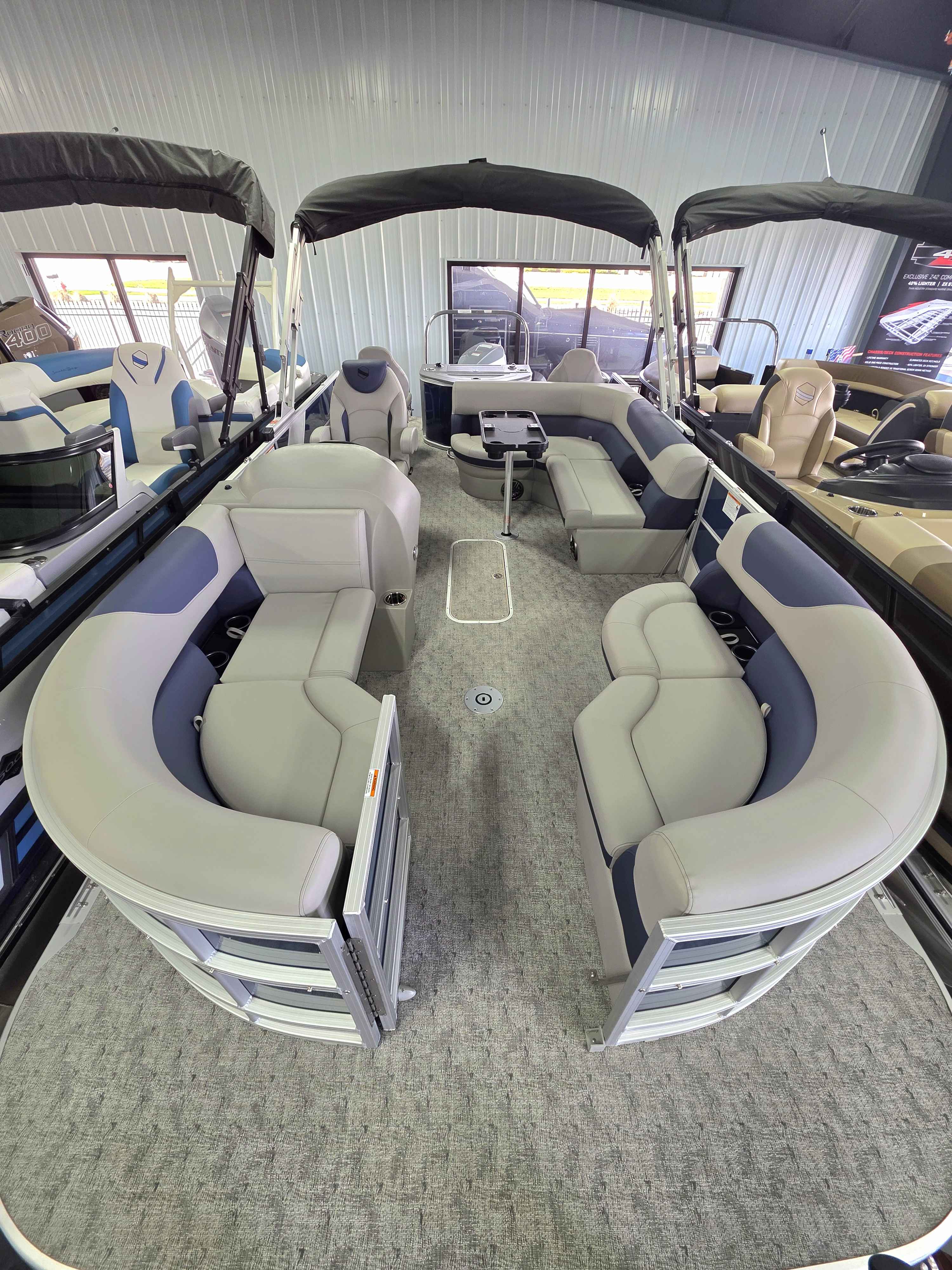 Exterior: Black Onyx and Navy Blue with Blackout Rail Package, Interior: Smoke TT and Navy Blue, Flooring: Titanium Standard, TriToon - Full Center Tube, In-Floor Storage, Power Electric Bimini, Mooring Cover in Coal, Lowrance Hook 5 Display, HD Folding Table, SS Ski Tow Bar, Trailer, and Many More Specs