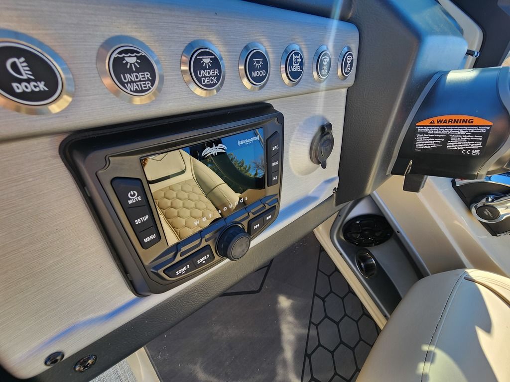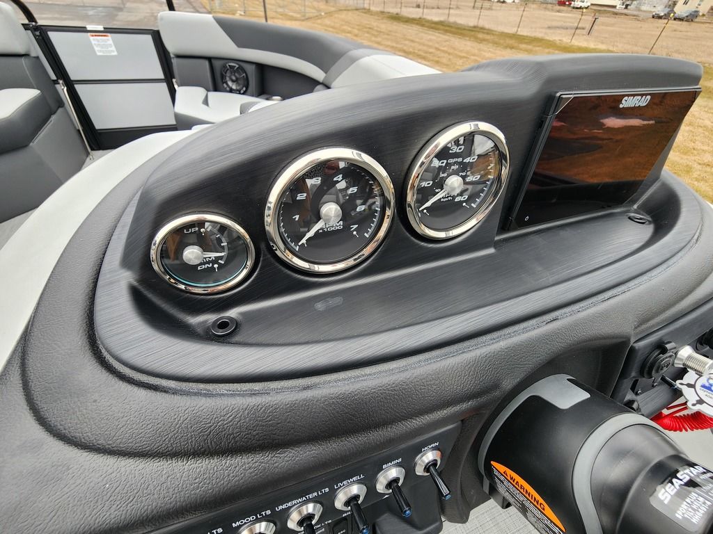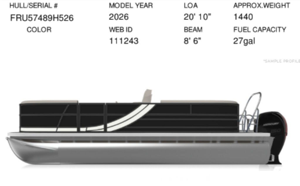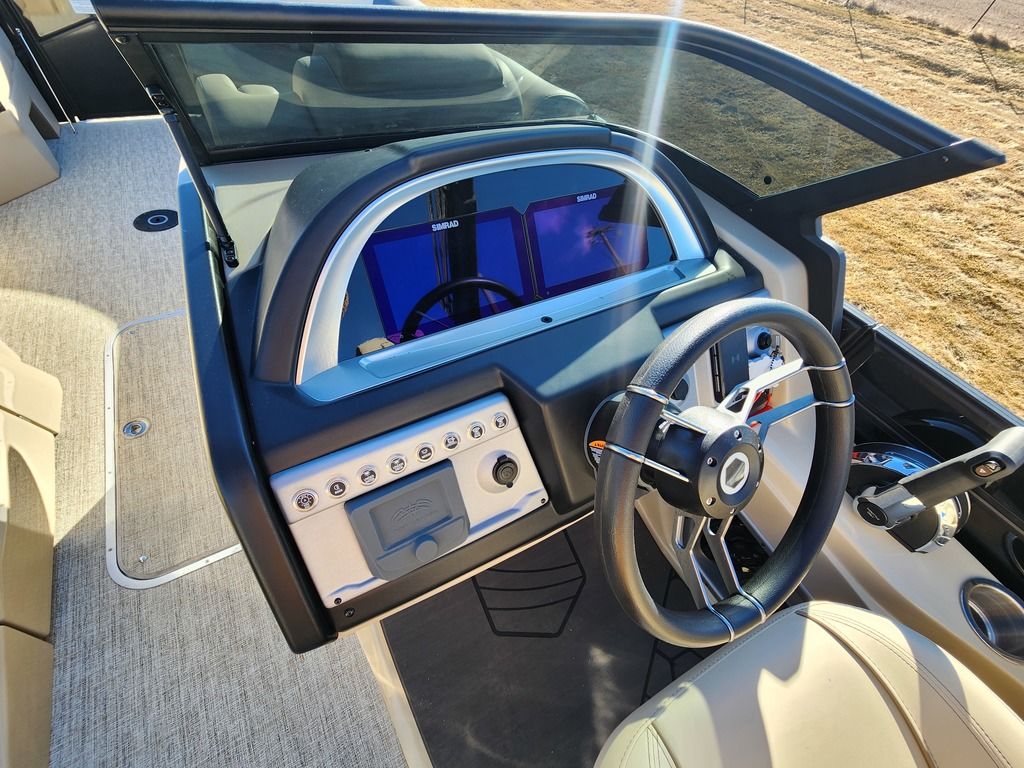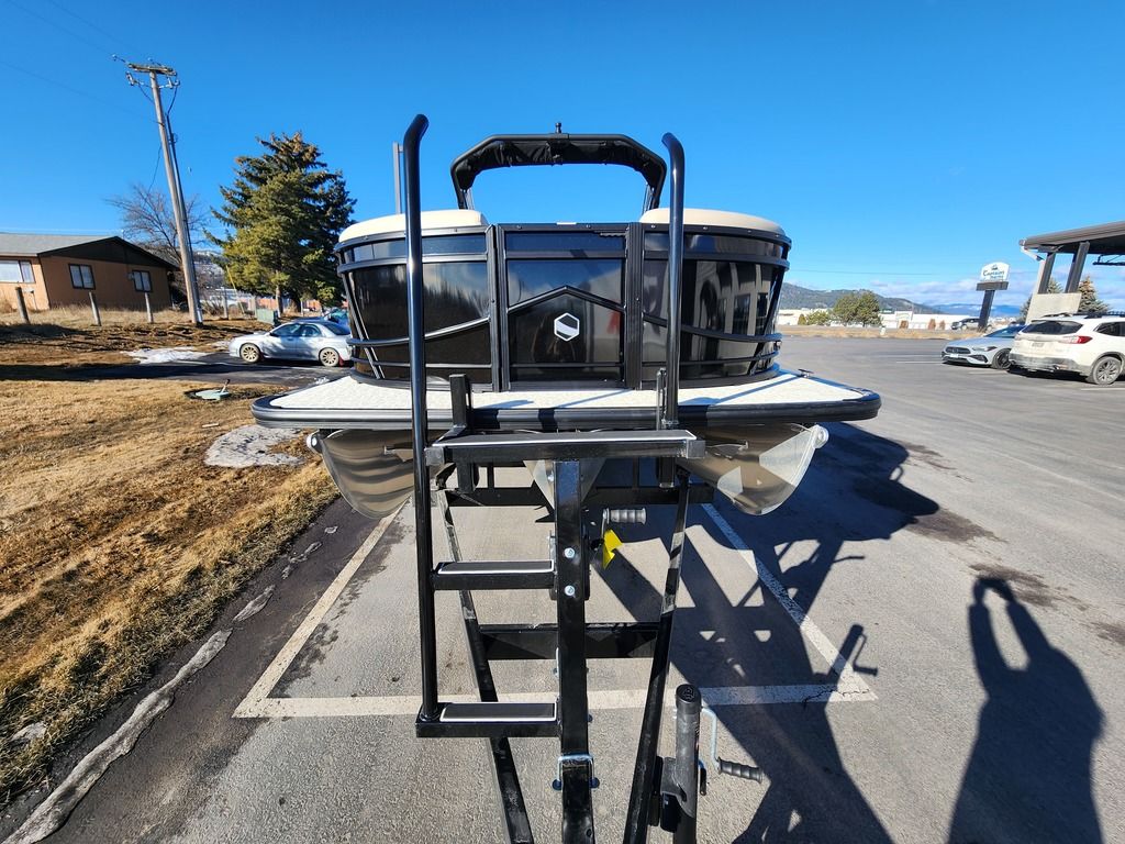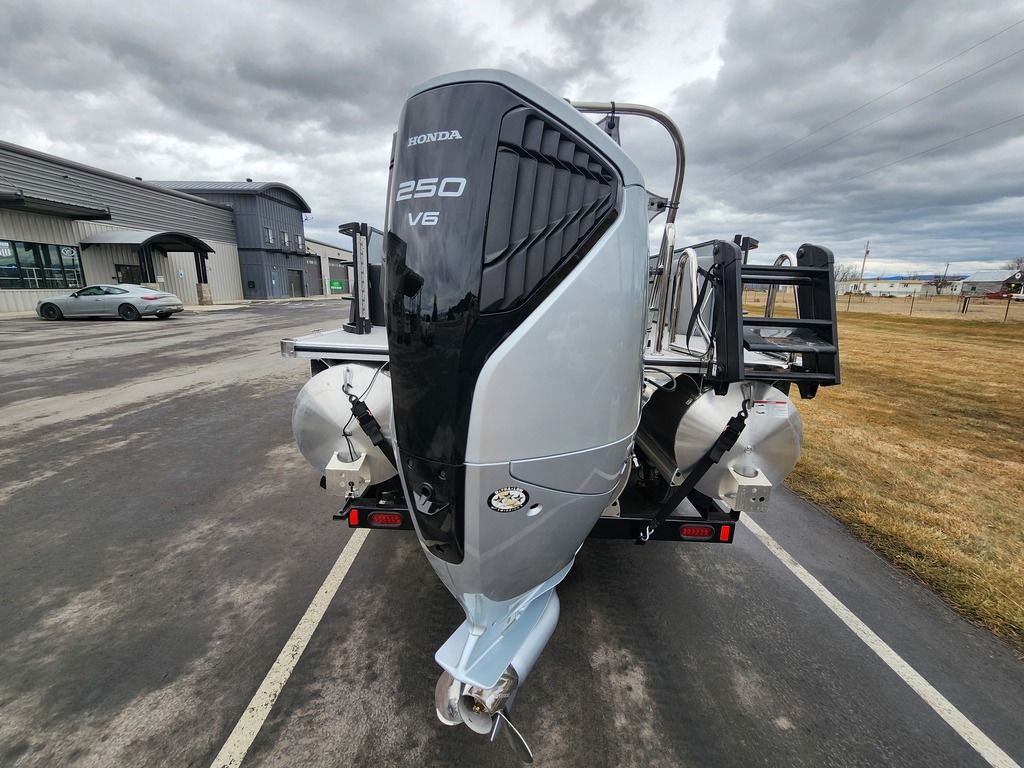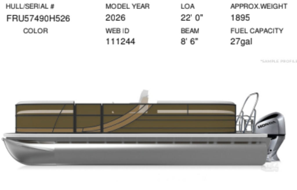 Exterior: Caribou Brown and Bronze with Blackout Rail Package, Interior: Latte TT and Caribou Brown, Flooring: Latte Standard, TriToon - Full Center Tube, Honda 200HP Outboard Motor, In-Floor Storage, Power Assist Steering, Power Electric Bimini, Mooring Cover in Coal, Lowrance Hook 5 Display, HD Folding Table, SS Ski Tow Bar, Trailer, and Many More Specs