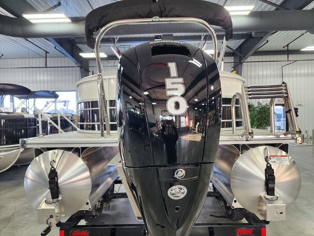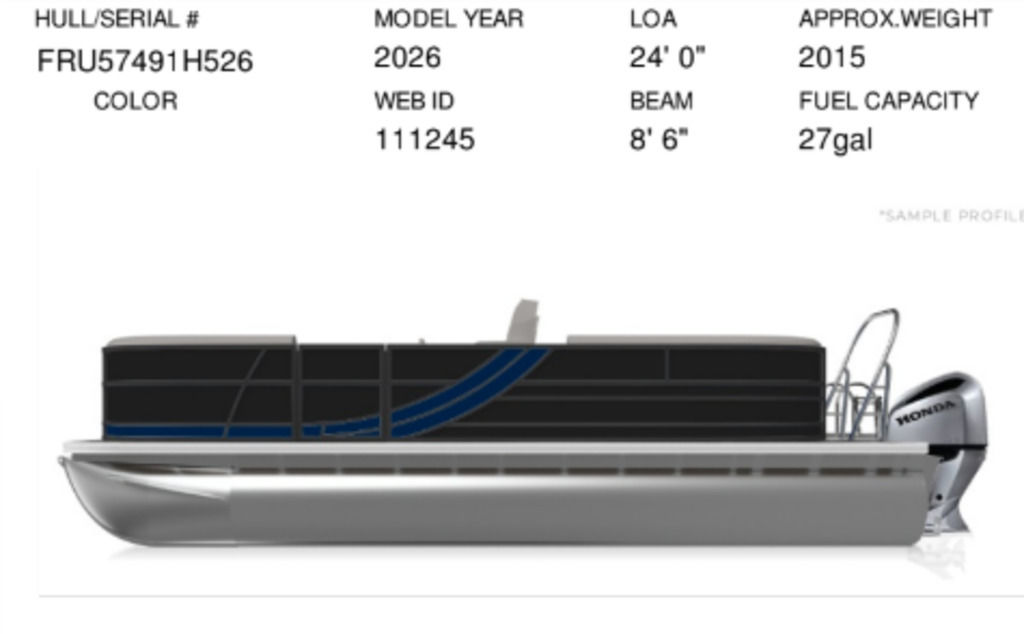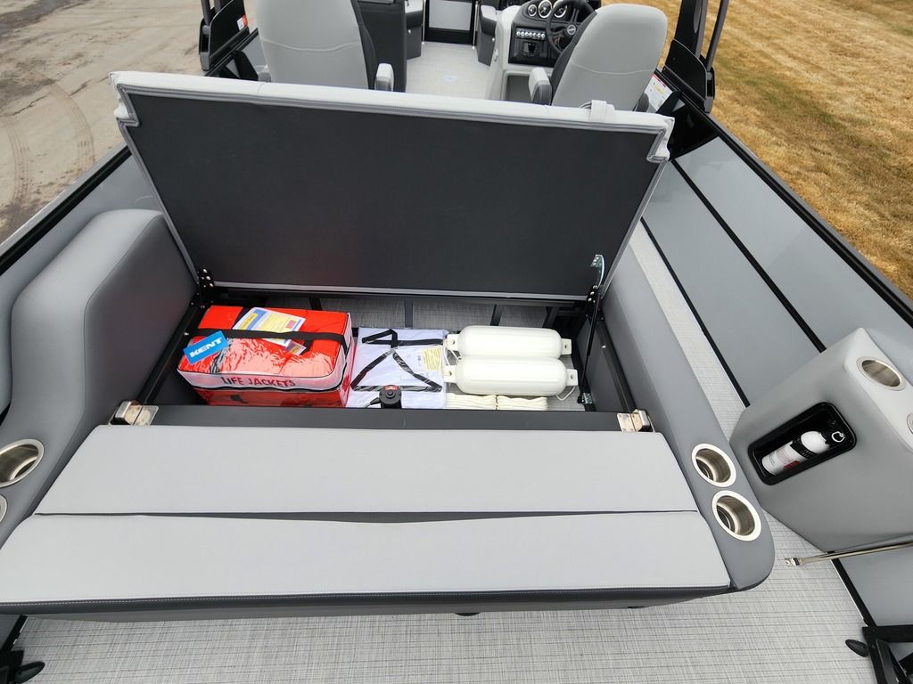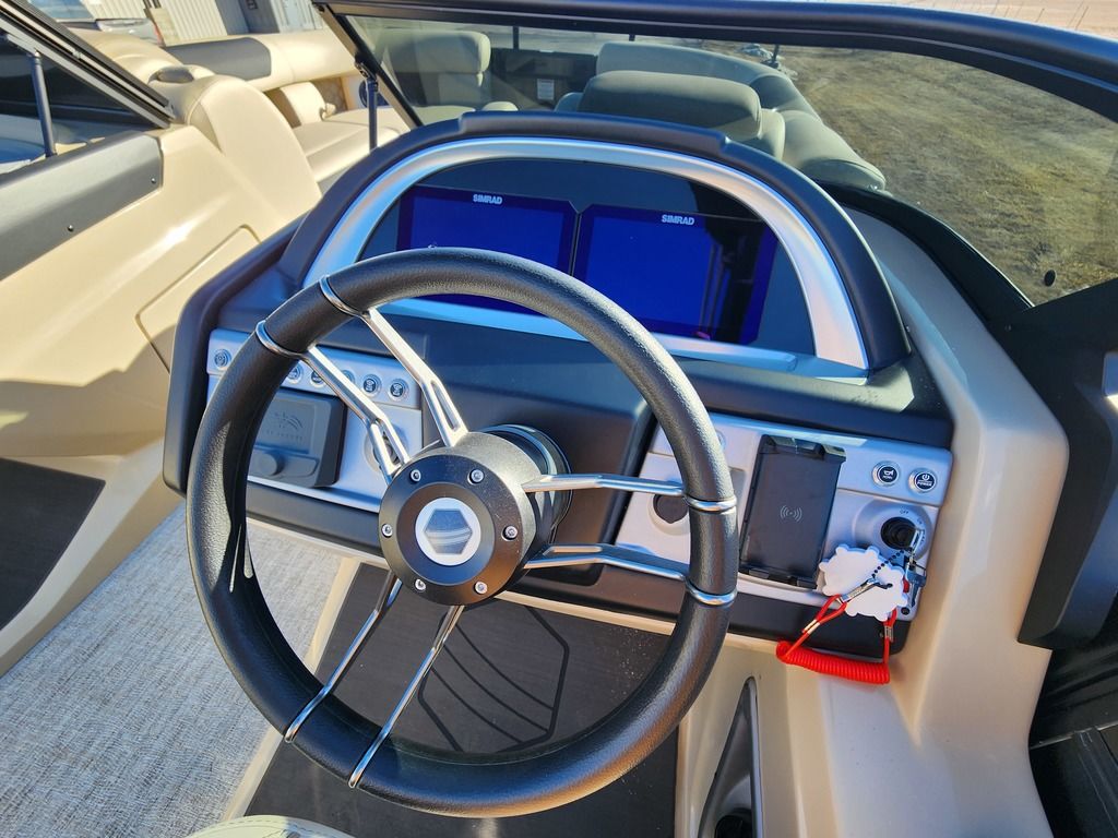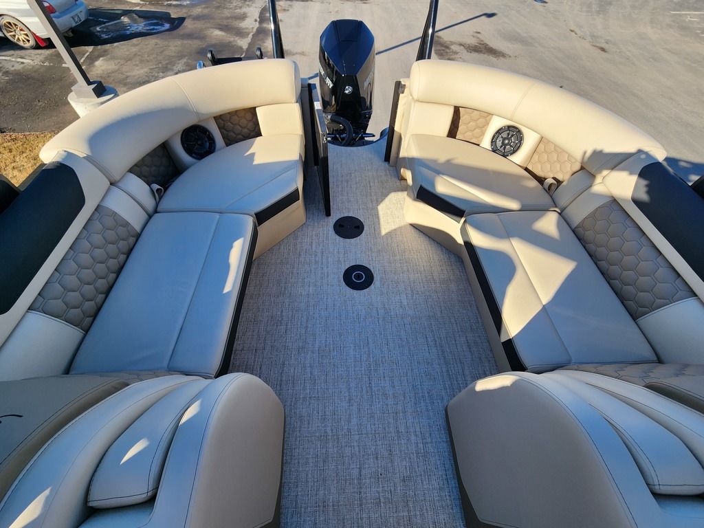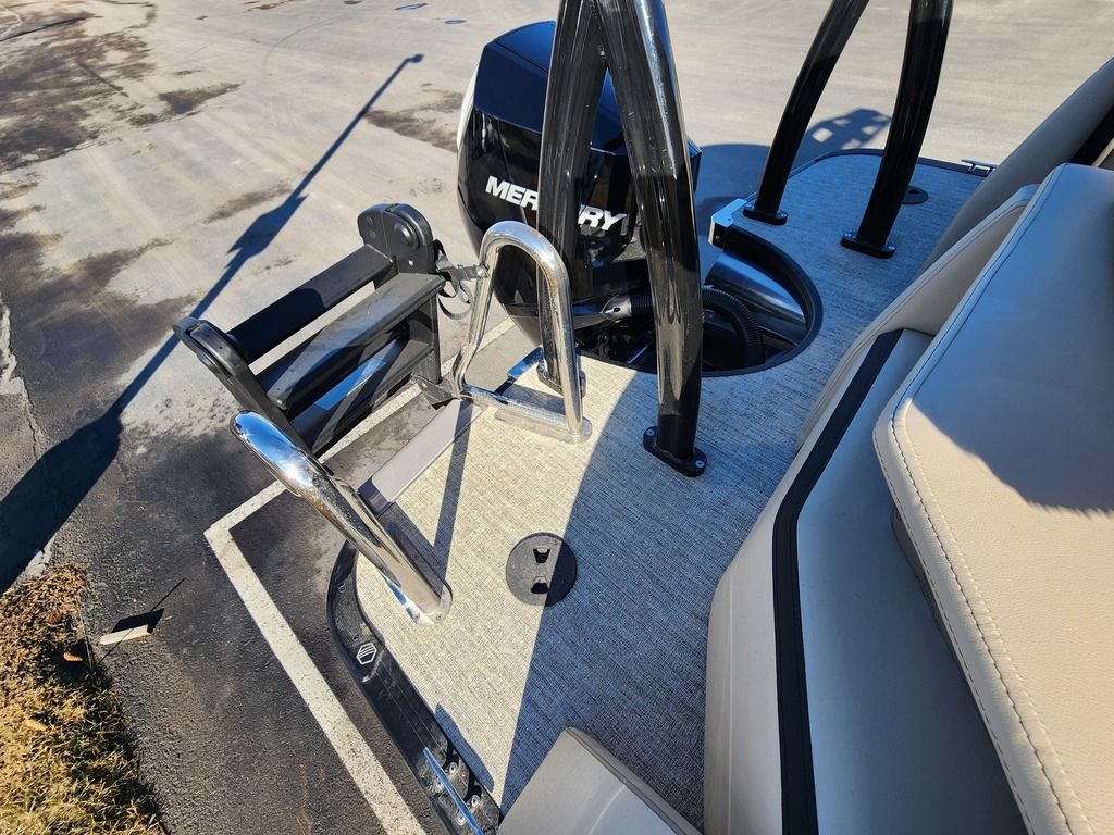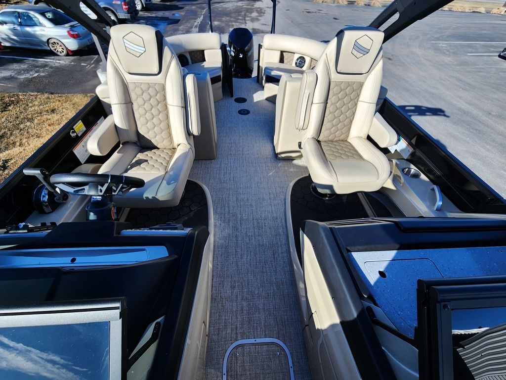 Exterior: Caribou Brown and Bronze with Blackout Rail Package, Interior: Latte TT and Caribou Brown, Flooring: Latte Standard, TriToon - Full Center Tube, Honda 200HP Outboard Motor, In-Floor Storage, Power Assist Steering, Power Electric Bimini, Mooring Cover in Coal, Lowrance Hook 5 Display, HD Folding Table, SS Ski Tow Bar, Trailer, and Many More Specs