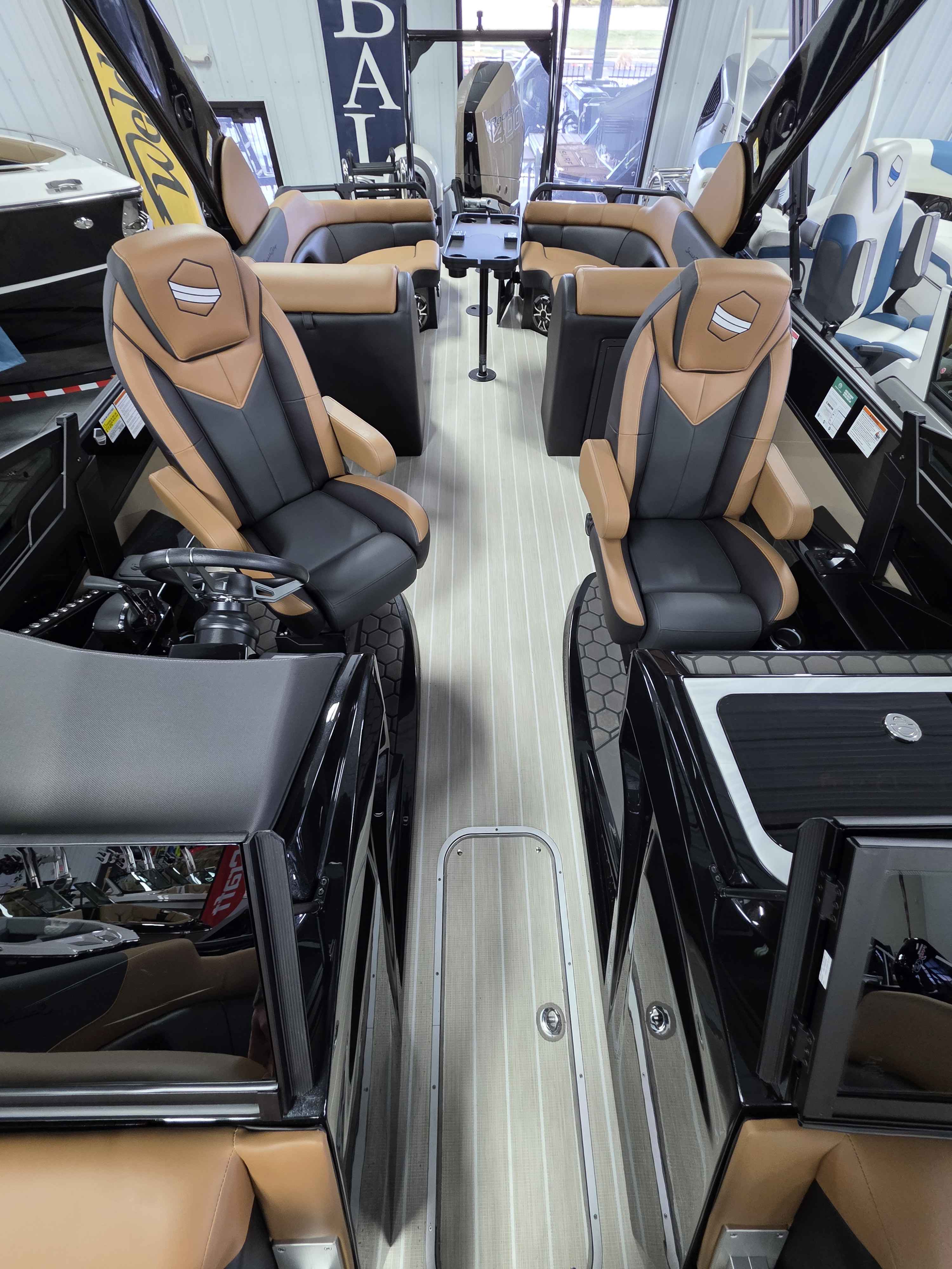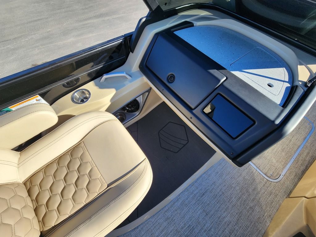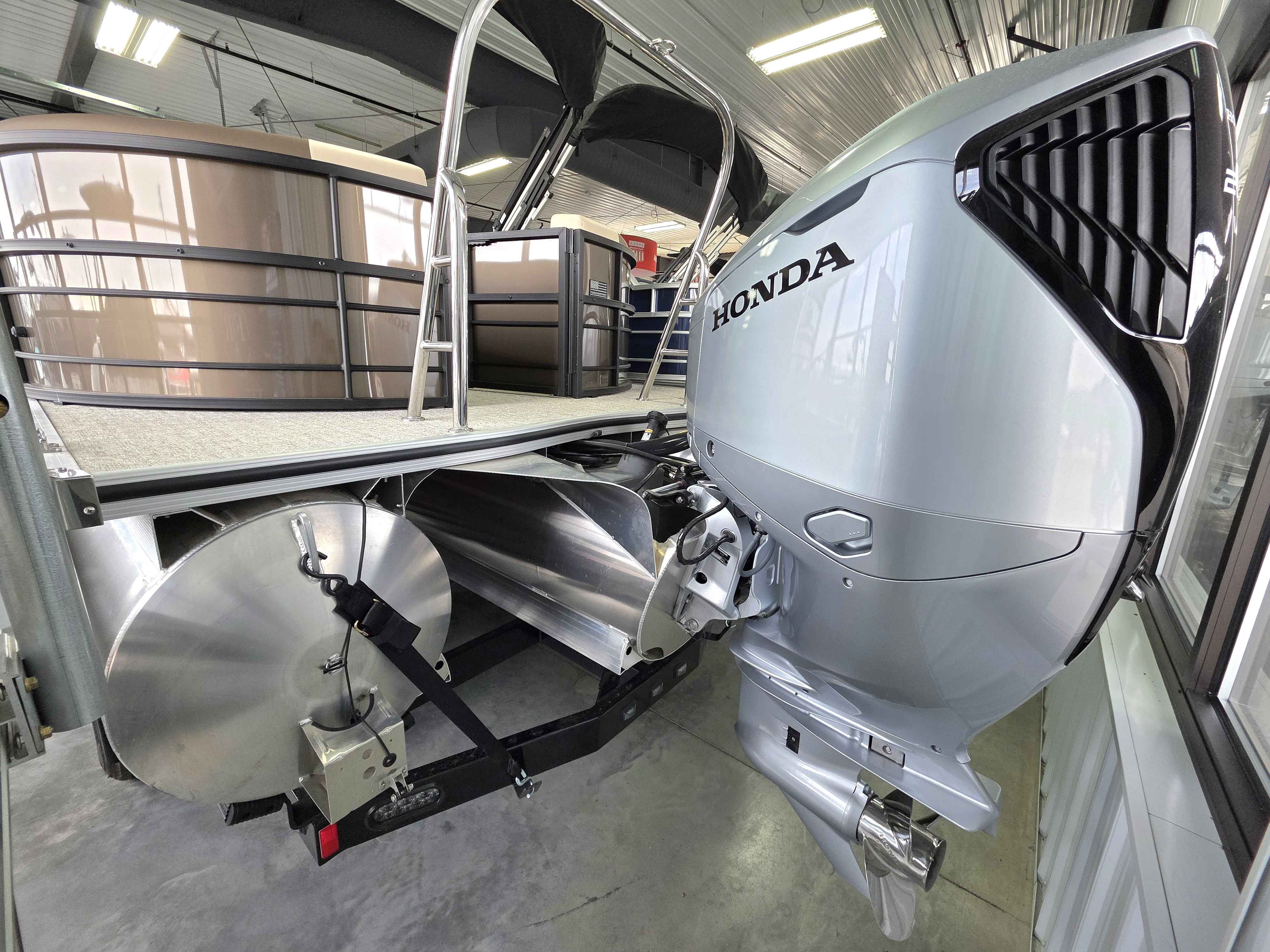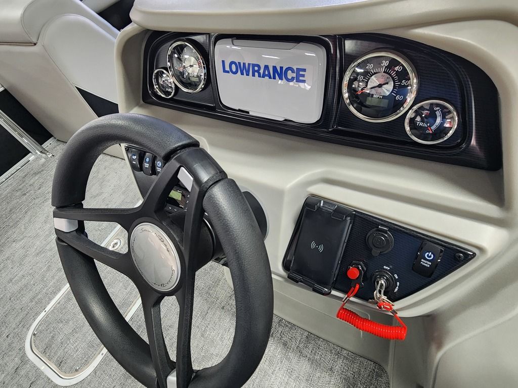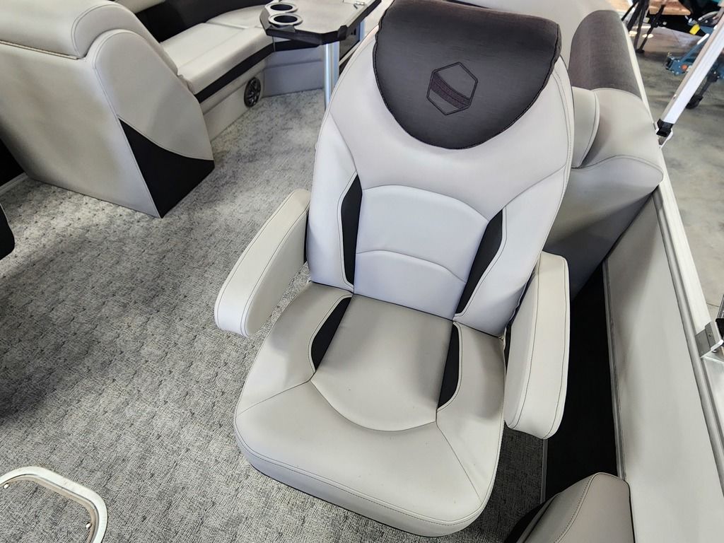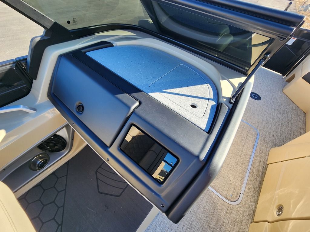 Exterior: Caribou Brown and Bronze with Blackout Rail Package, Interior: Latte TT and Caribou Brown, Flooring: Latte Standard, TriToon - Full Center Tube, Honda 200HP Outboard Motor, In-Floor Storage, Power Assist Steering, Power Electric Bimini, Mooring Cover in Coal, Lowrance Hook 5 Display, HD Folding Table, SS Ski Tow Bar, Trailer, and Many More Specs