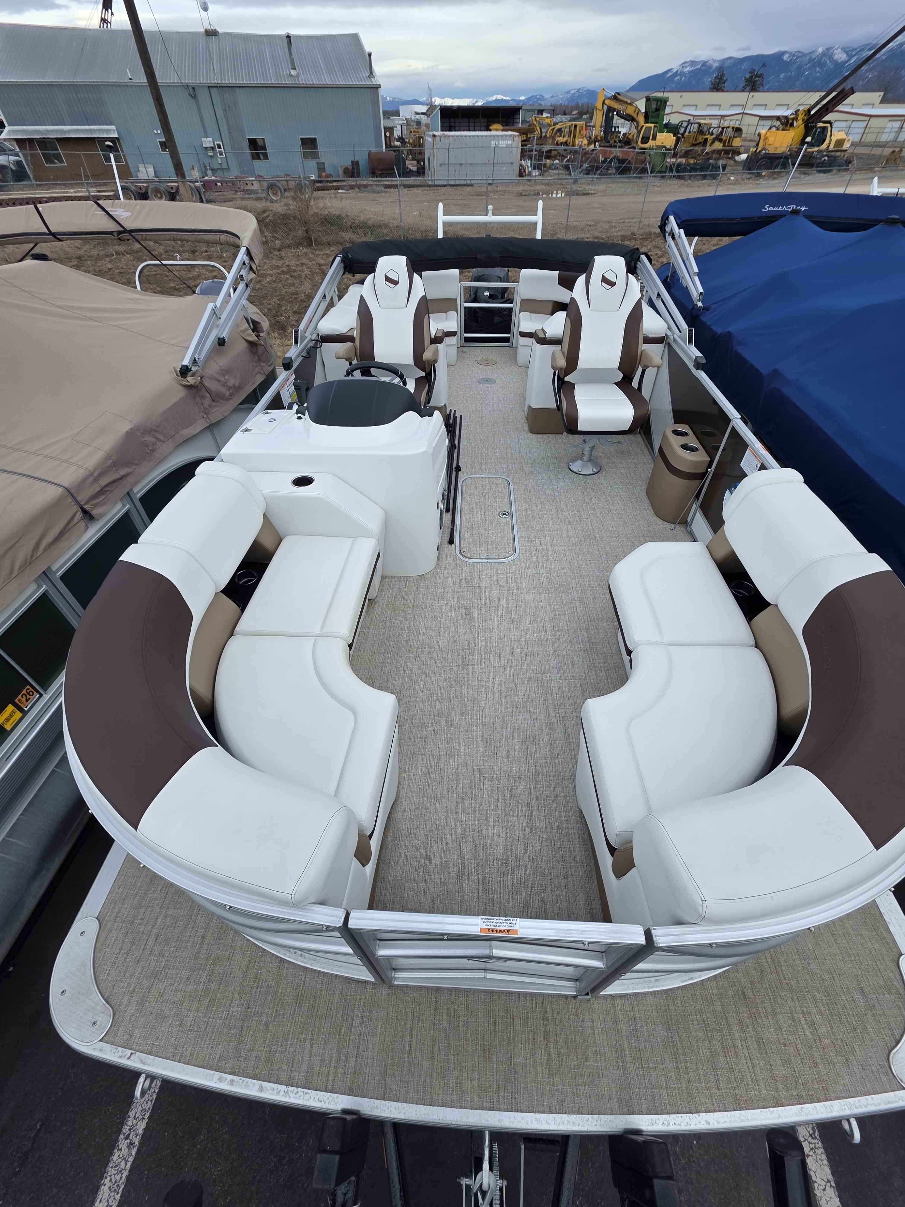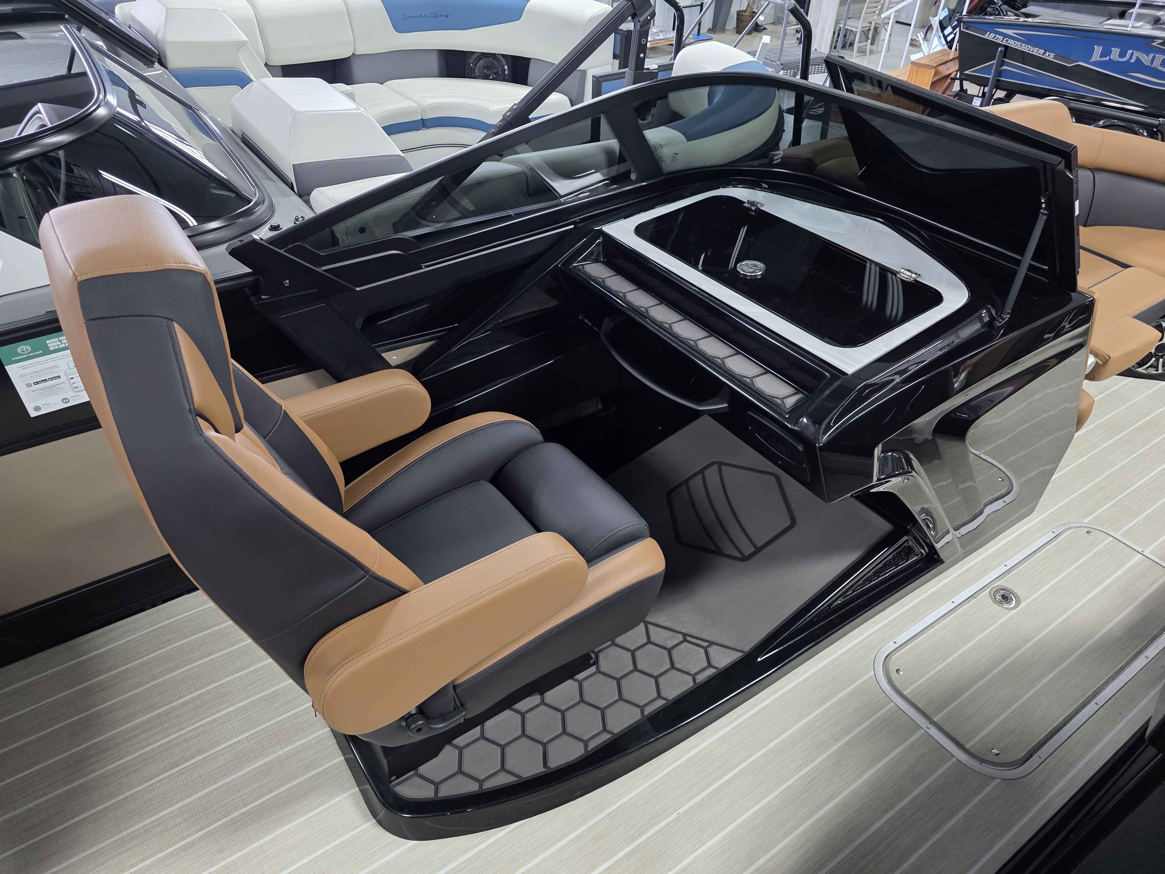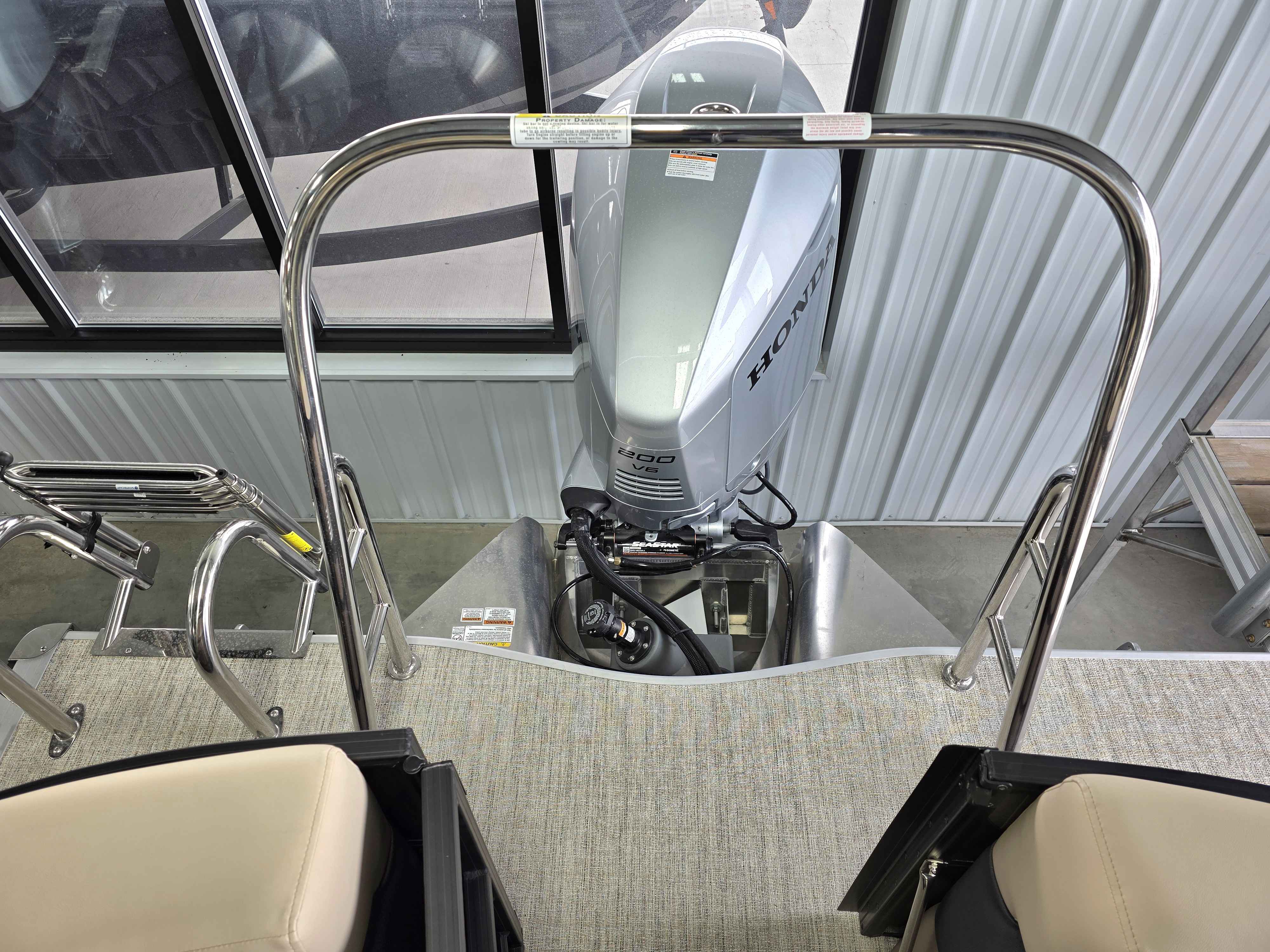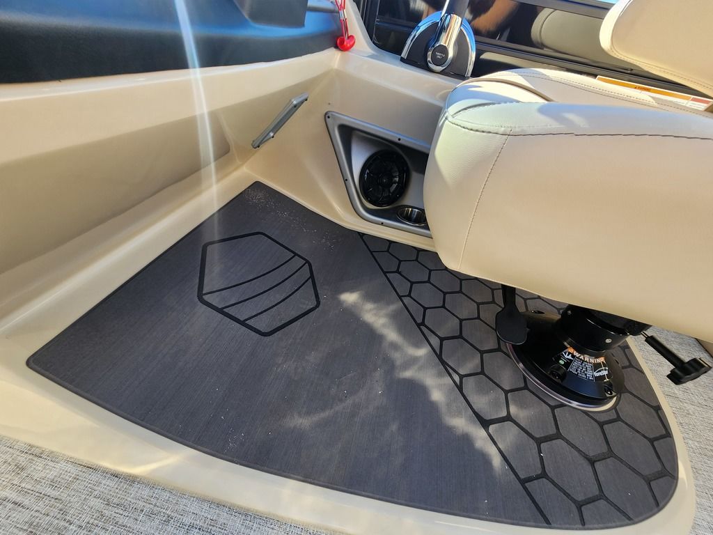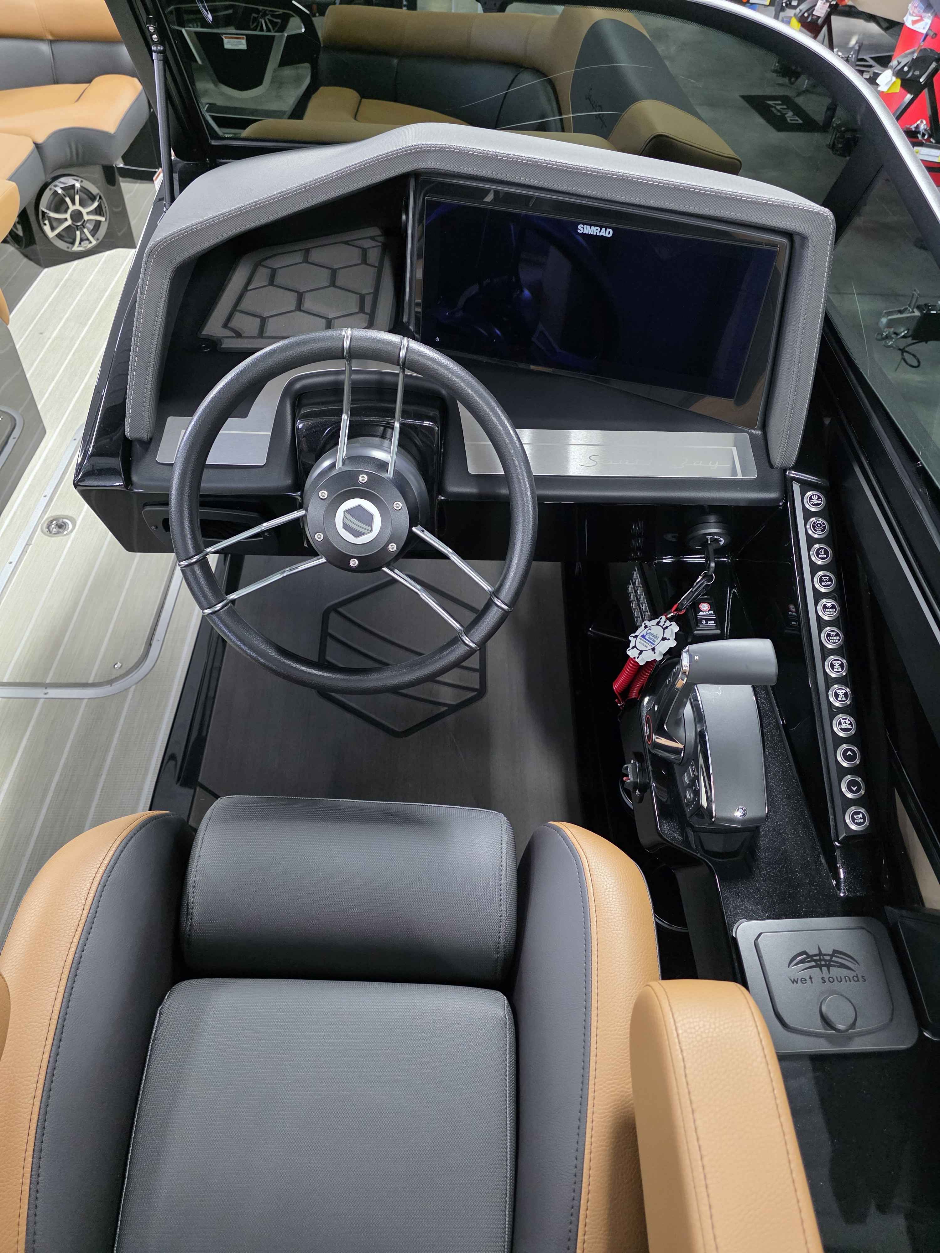 Exterior: Caribou Brown and Bronze with Blackout Rail Package, Interior: Latte TT and Caribou Brown, Flooring: Latte Standard, TriToon - Full Center Tube, Honda 200HP Outboard Motor, In-Floor Storage, Power Assist Steering, Power Electric Bimini, Mooring Cover in Coal, Lowrance Hook 5 Display, HD Folding Table, SS Ski Tow Bar, Trailer, and Many More Specs