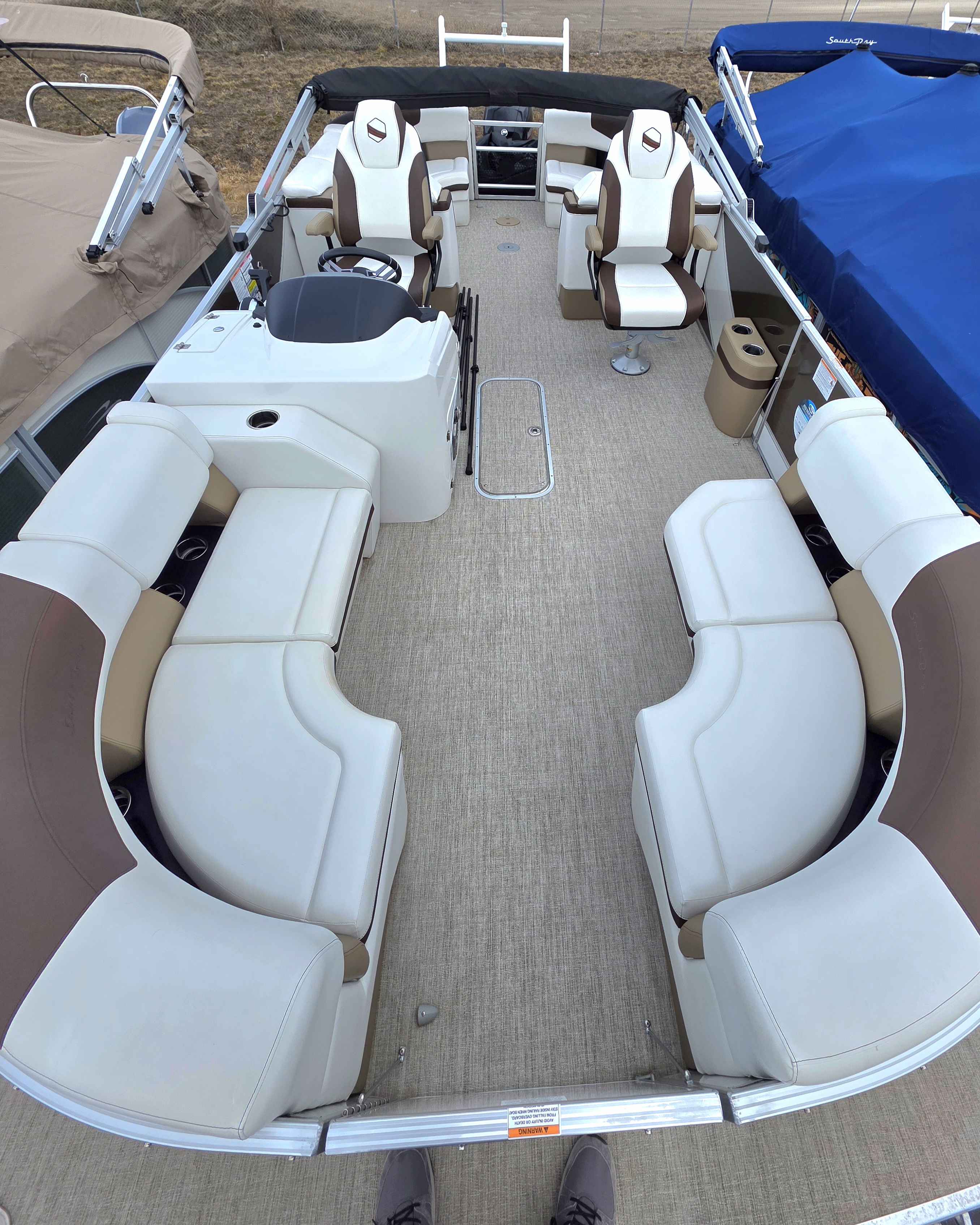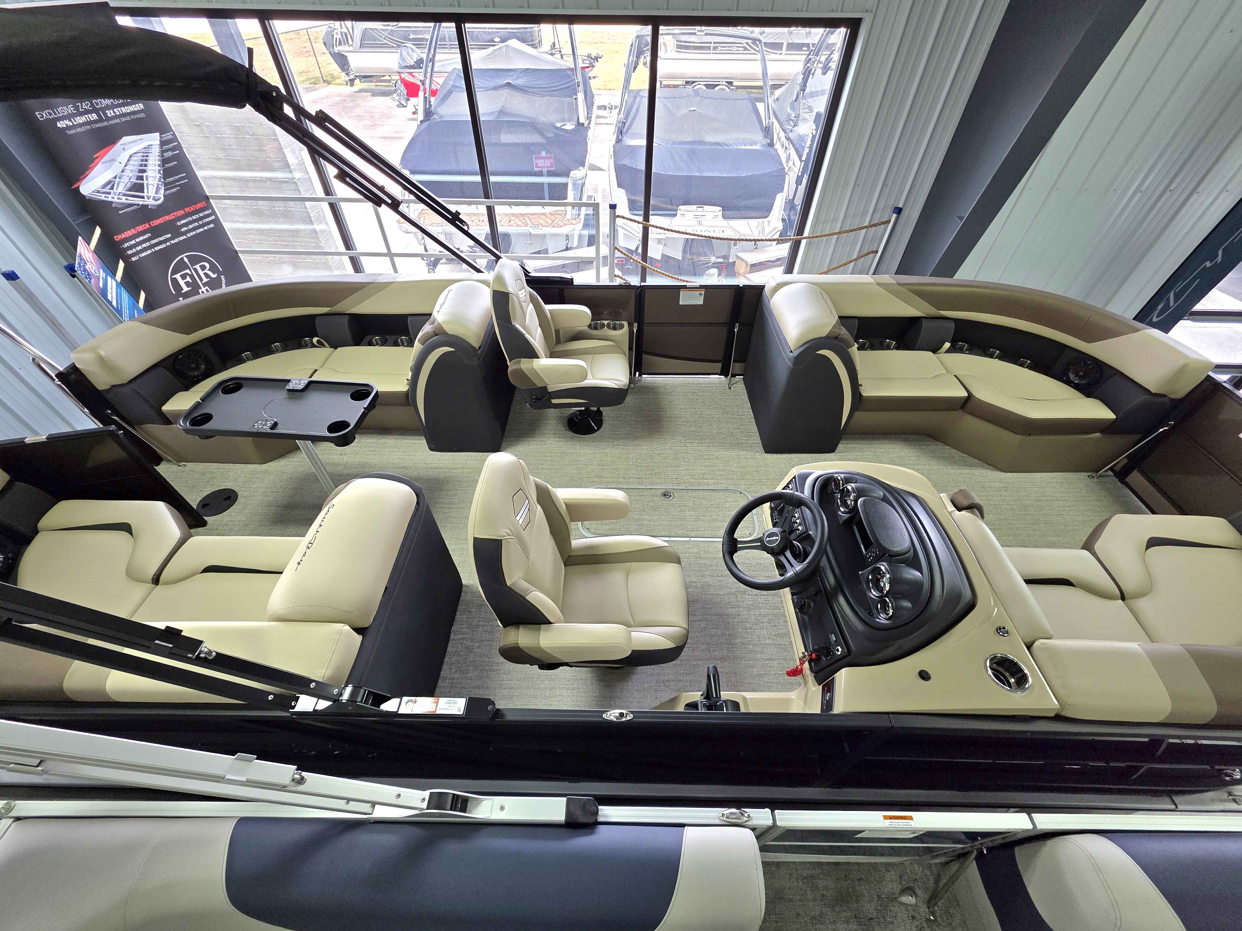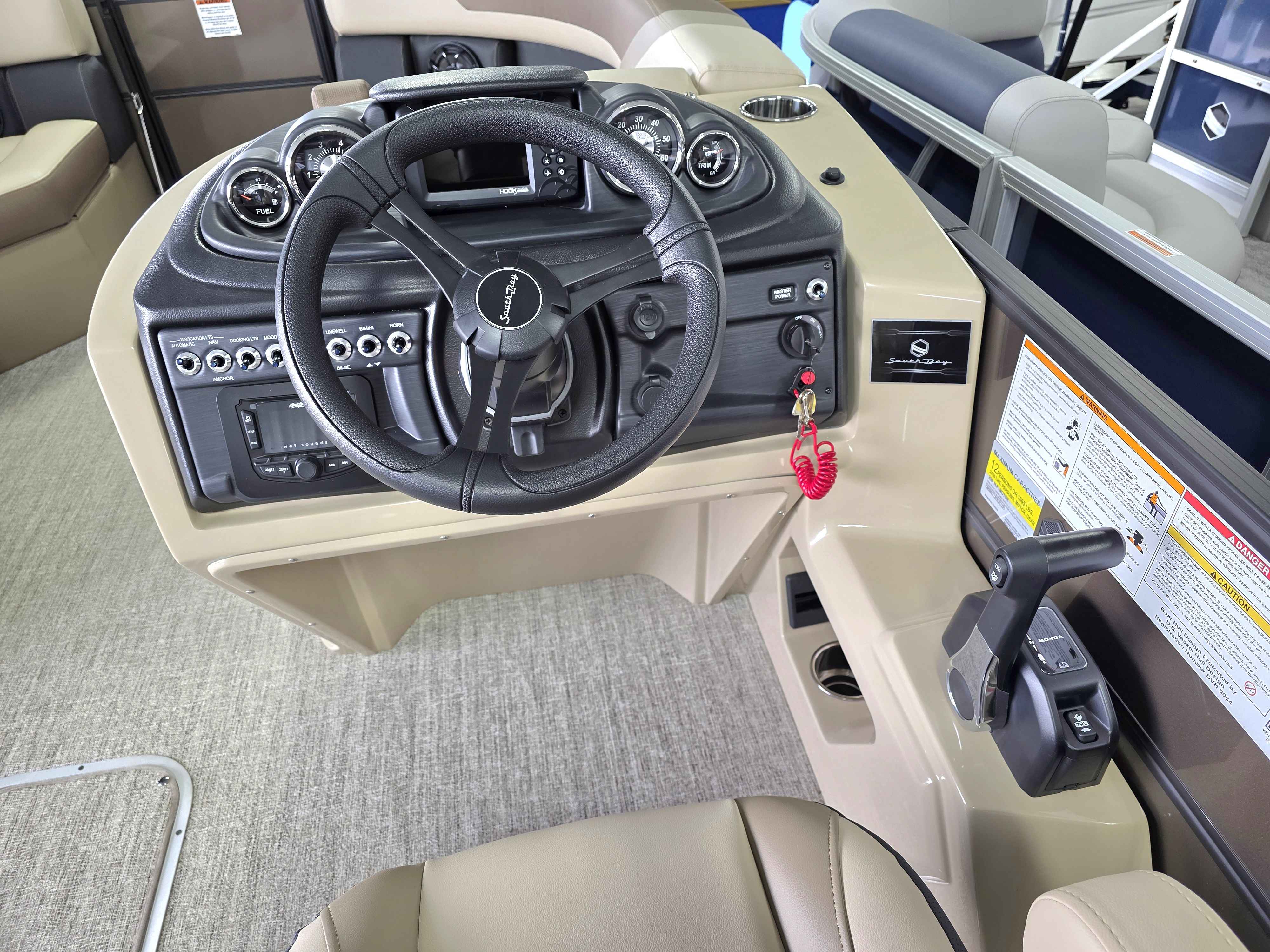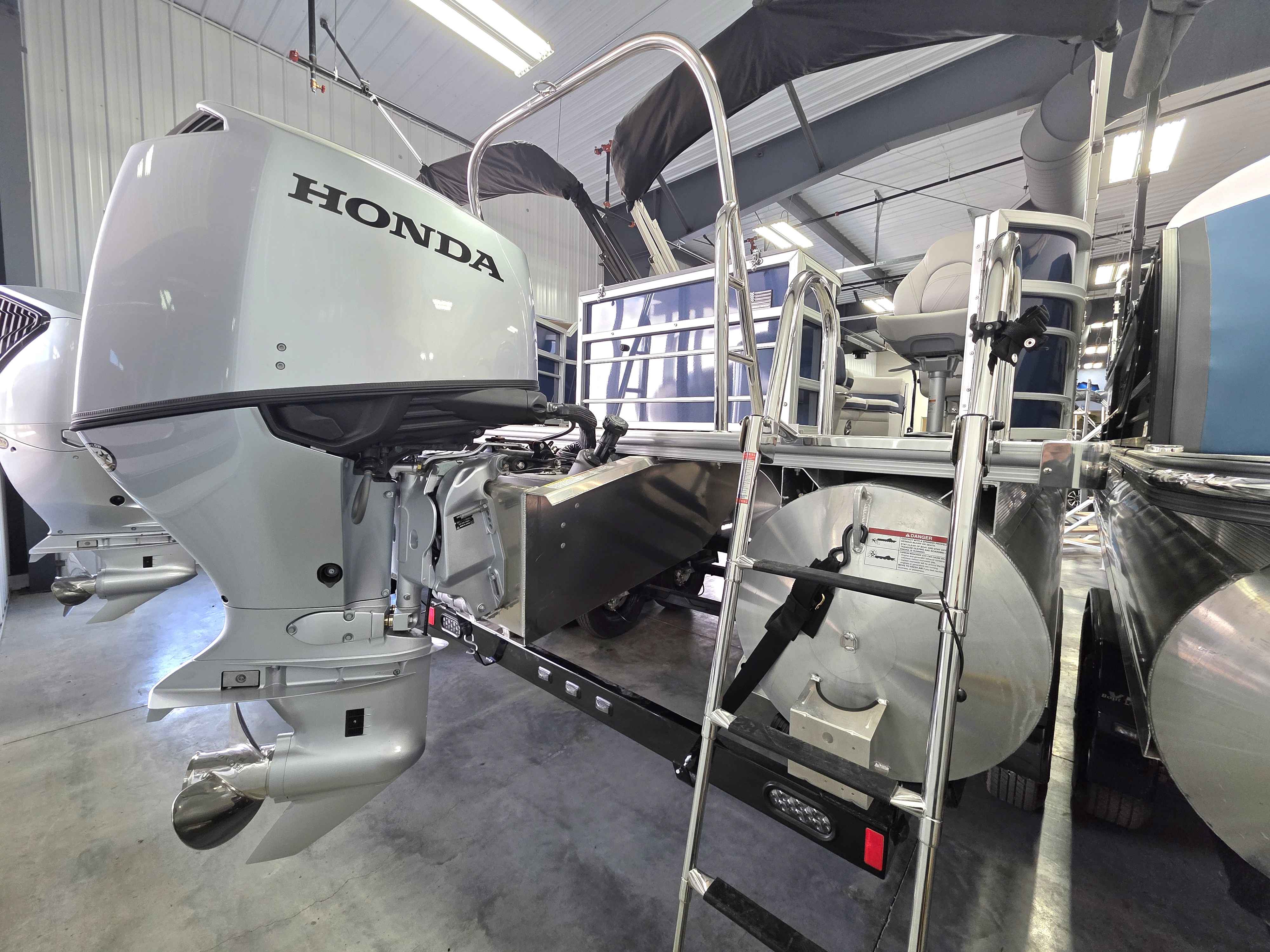 Exterior: Caribou Brown and Bronze with Blackout Rail Package, Interior: Latte TT and Caribou Brown, Flooring: Latte Standard, TriToon - Full Center Tube, Honda 200HP Outboard Motor, In-Floor Storage, Power Assist Steering, Power Electric Bimini, Mooring Cover in Coal, Lowrance Hook 5 Display, HD Folding Table, SS Ski Tow Bar, Trailer, and Many More Specs