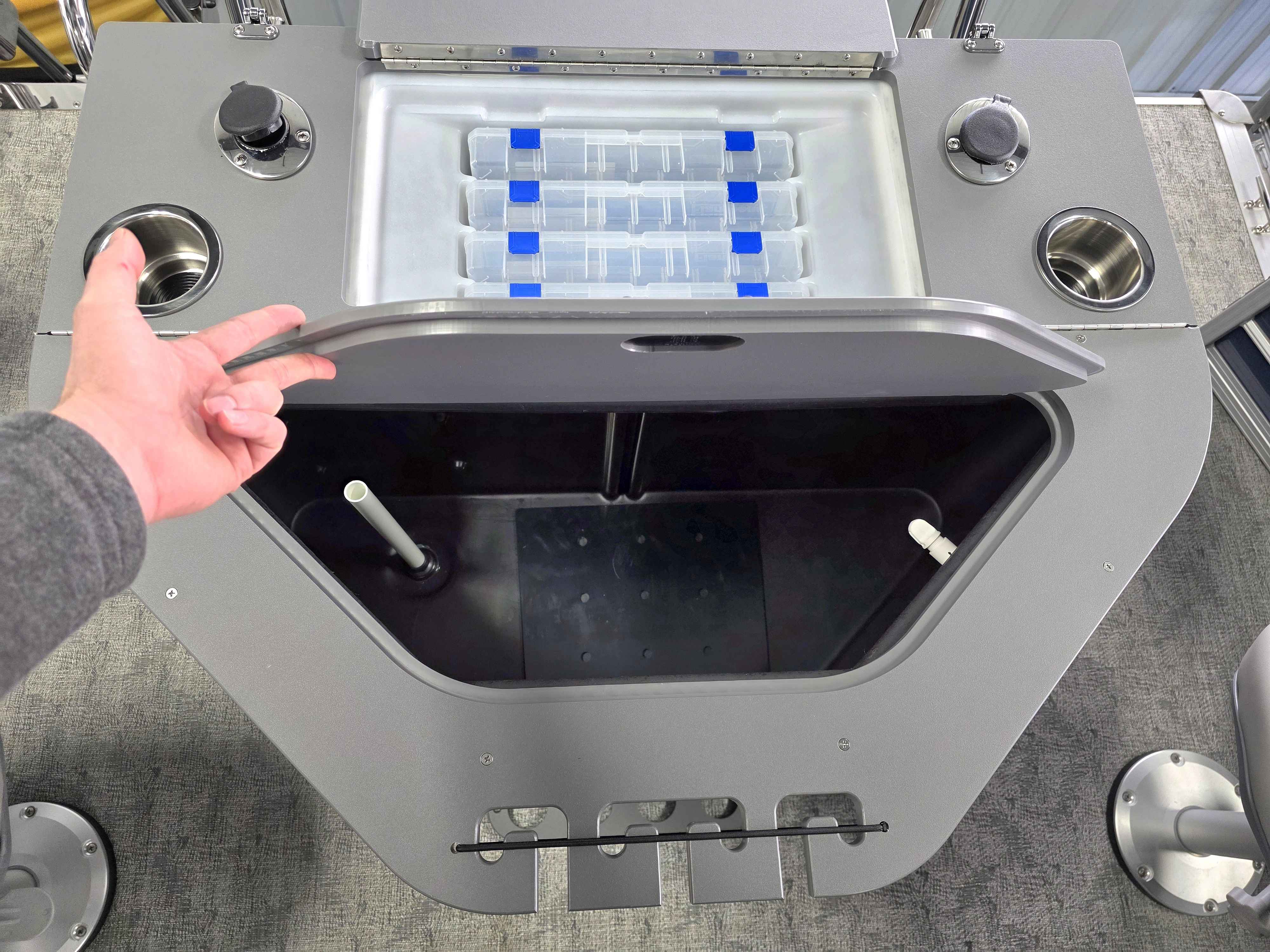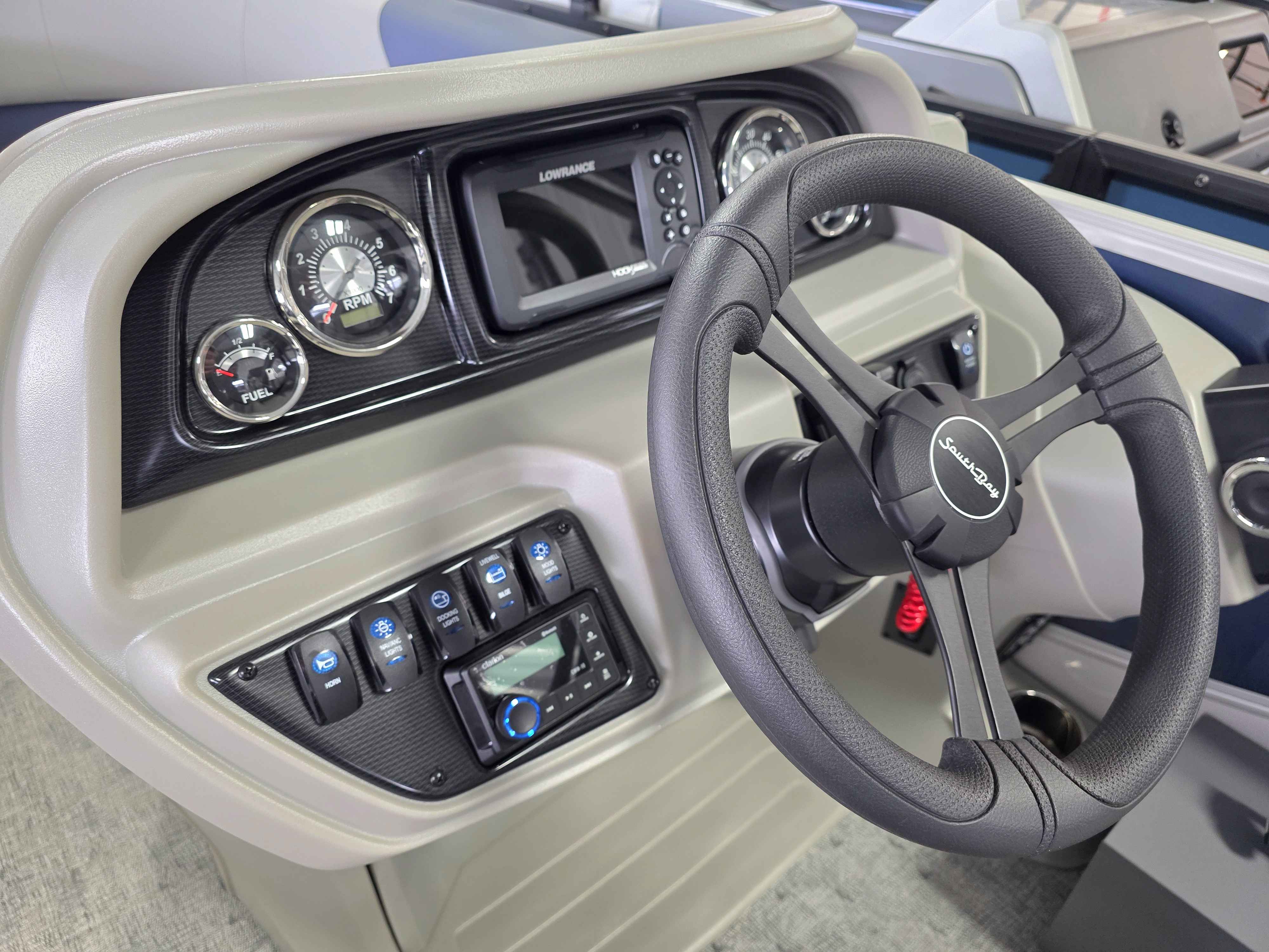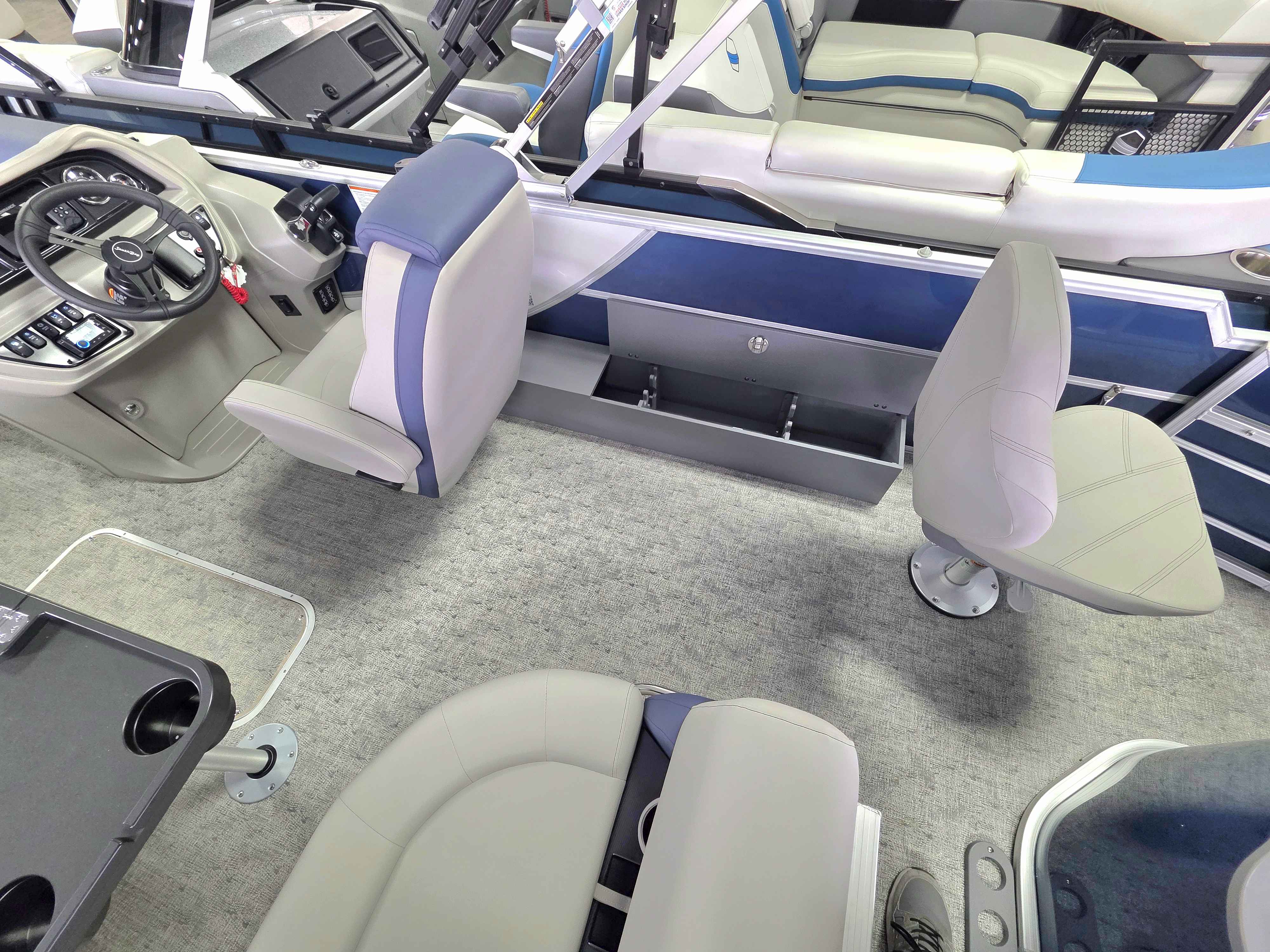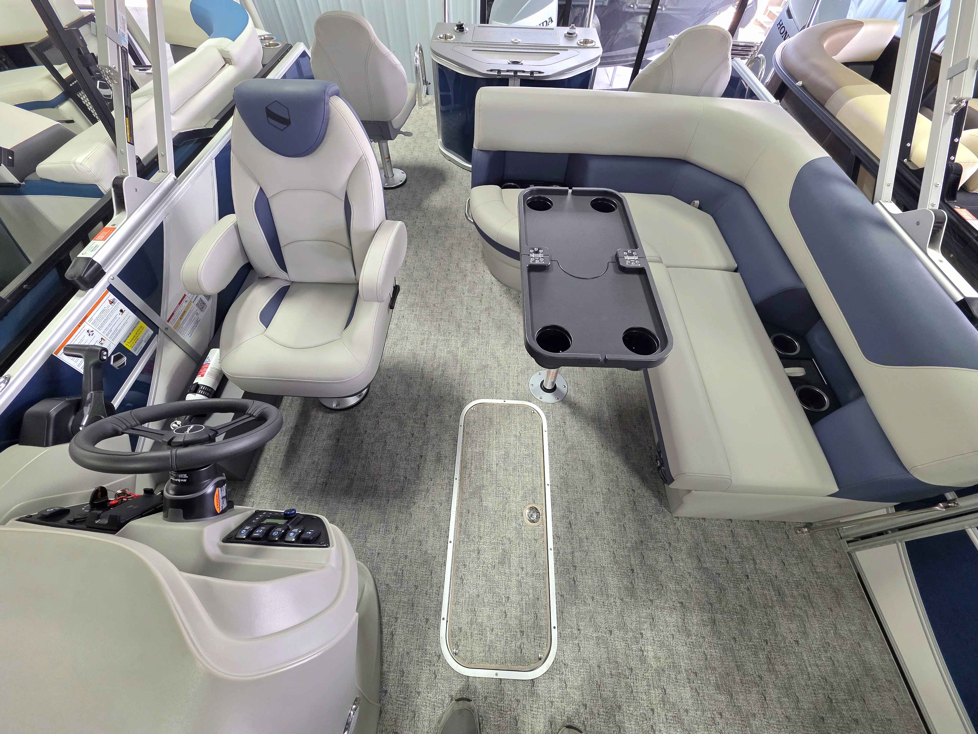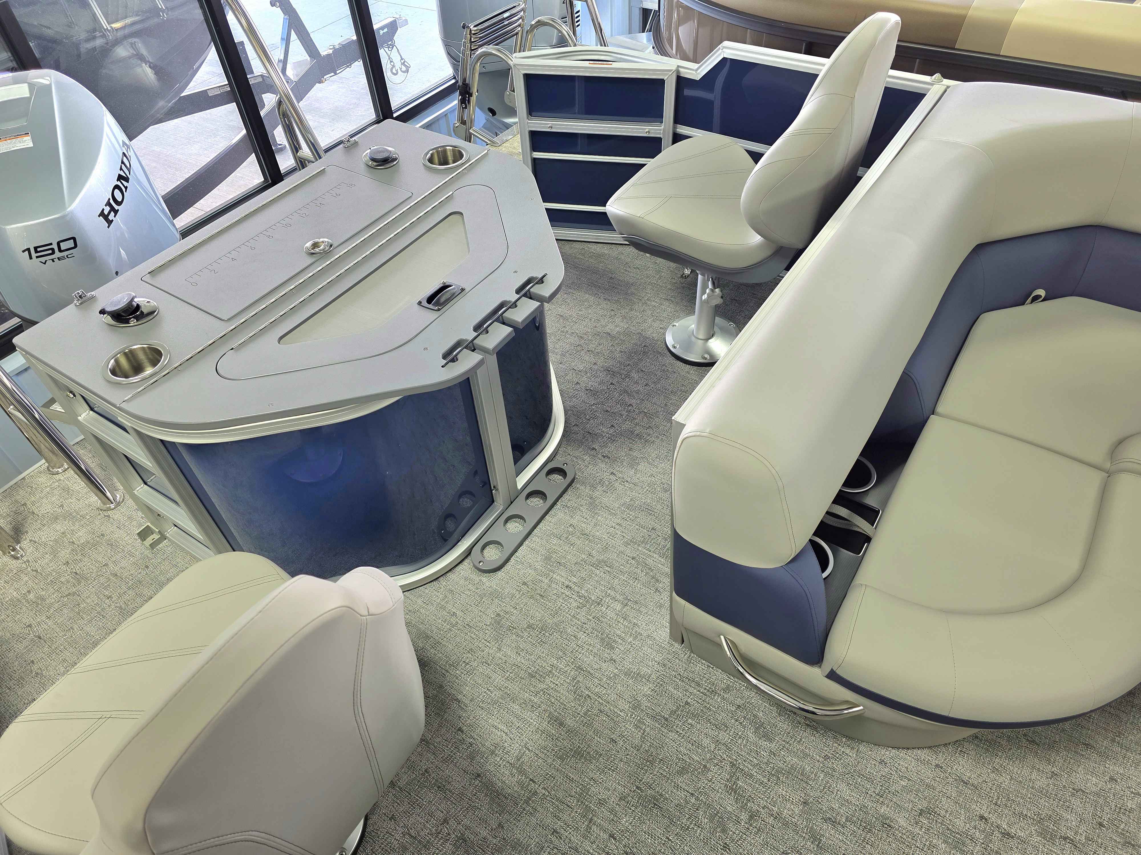 Exterior: Navy Blue and Pearl White, Interior: Granite and Navy Blue, Flooring: Coastal Concrete Standard, TriToon - Center Sport Tube, LE In-Floor Storage, Power Electric Bimini, Mooring Cover in Coal, Lowrance Hook 5 Display, HD Folding Table, Additional Table Base, Centric II Stem Fishing Chairs, Horizontal Rod Locker, SS Ski Tow Bar, Trailer, and Many More Specs