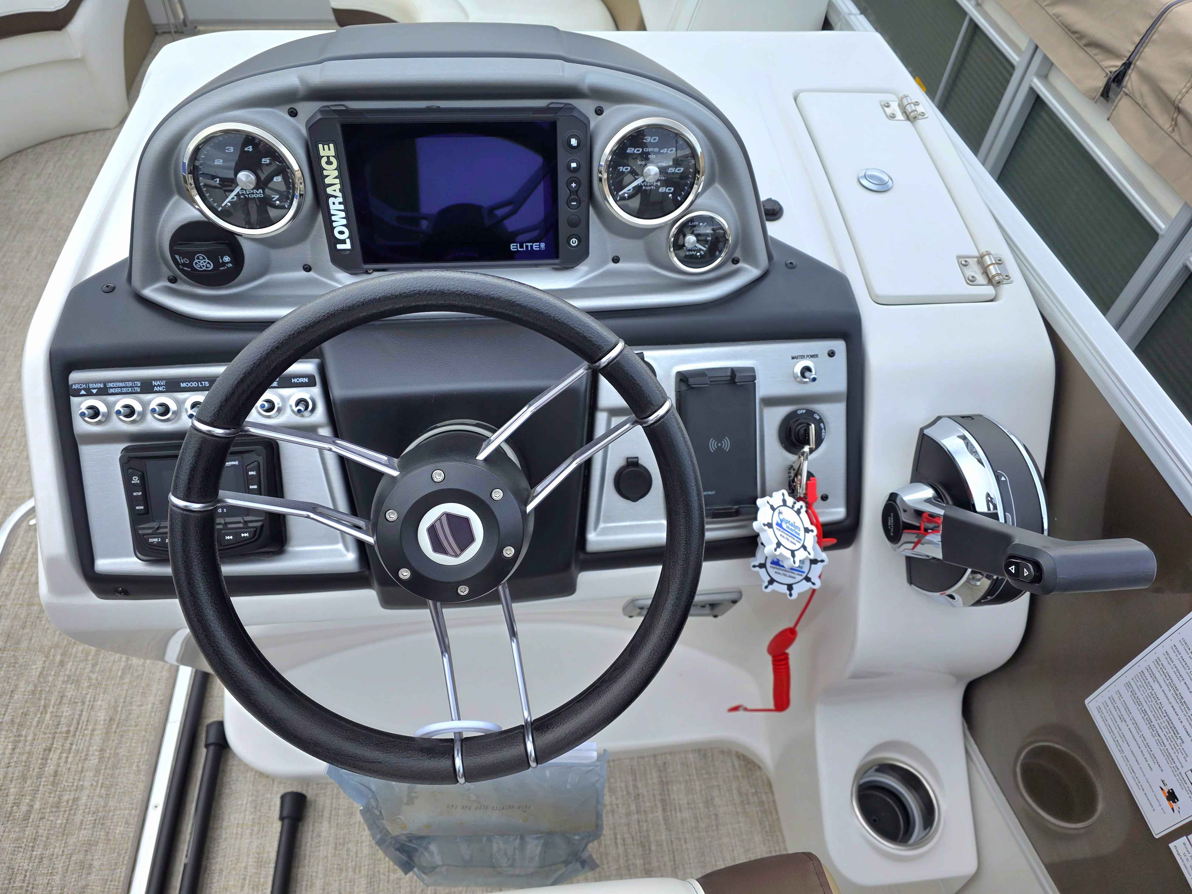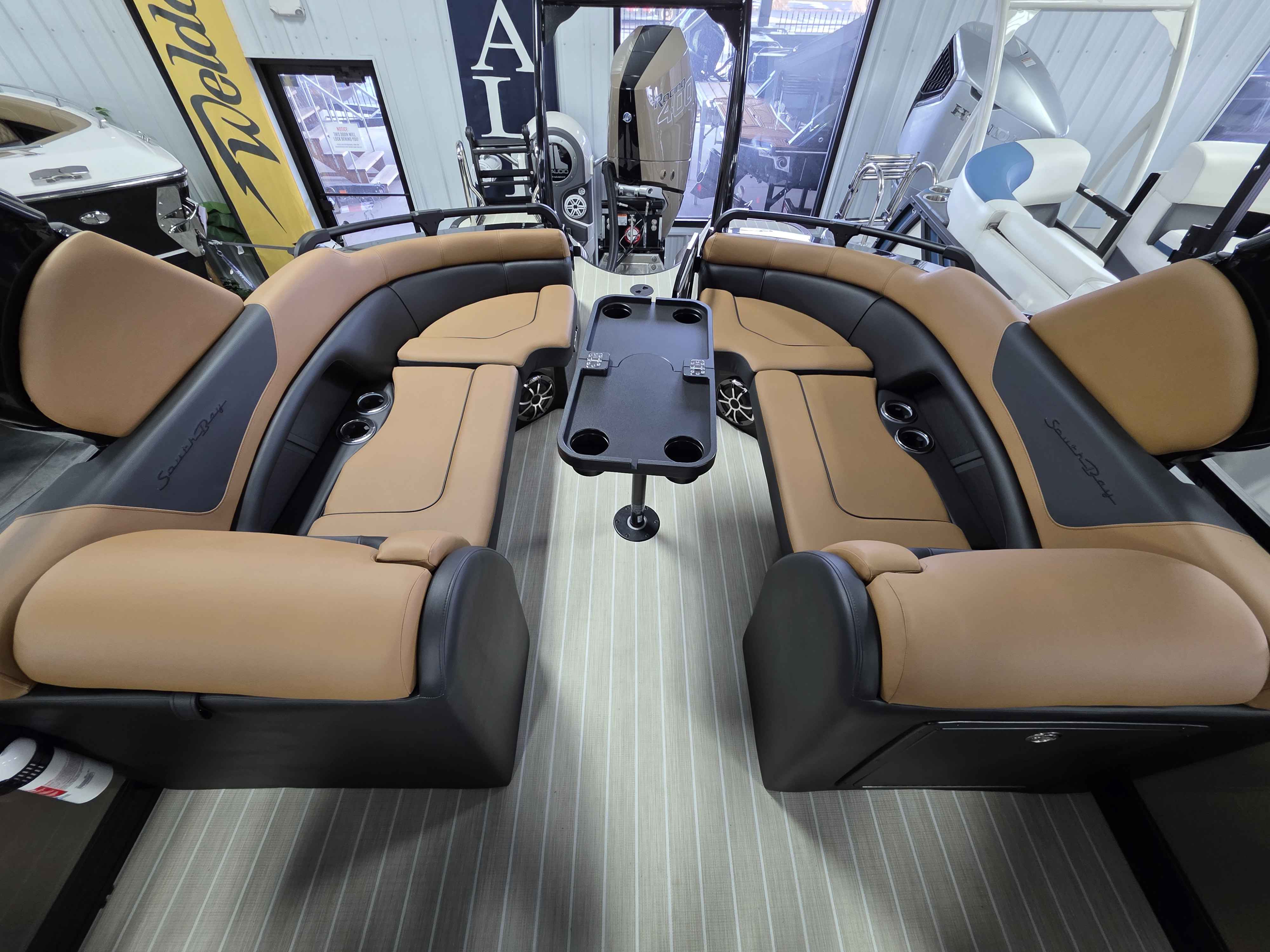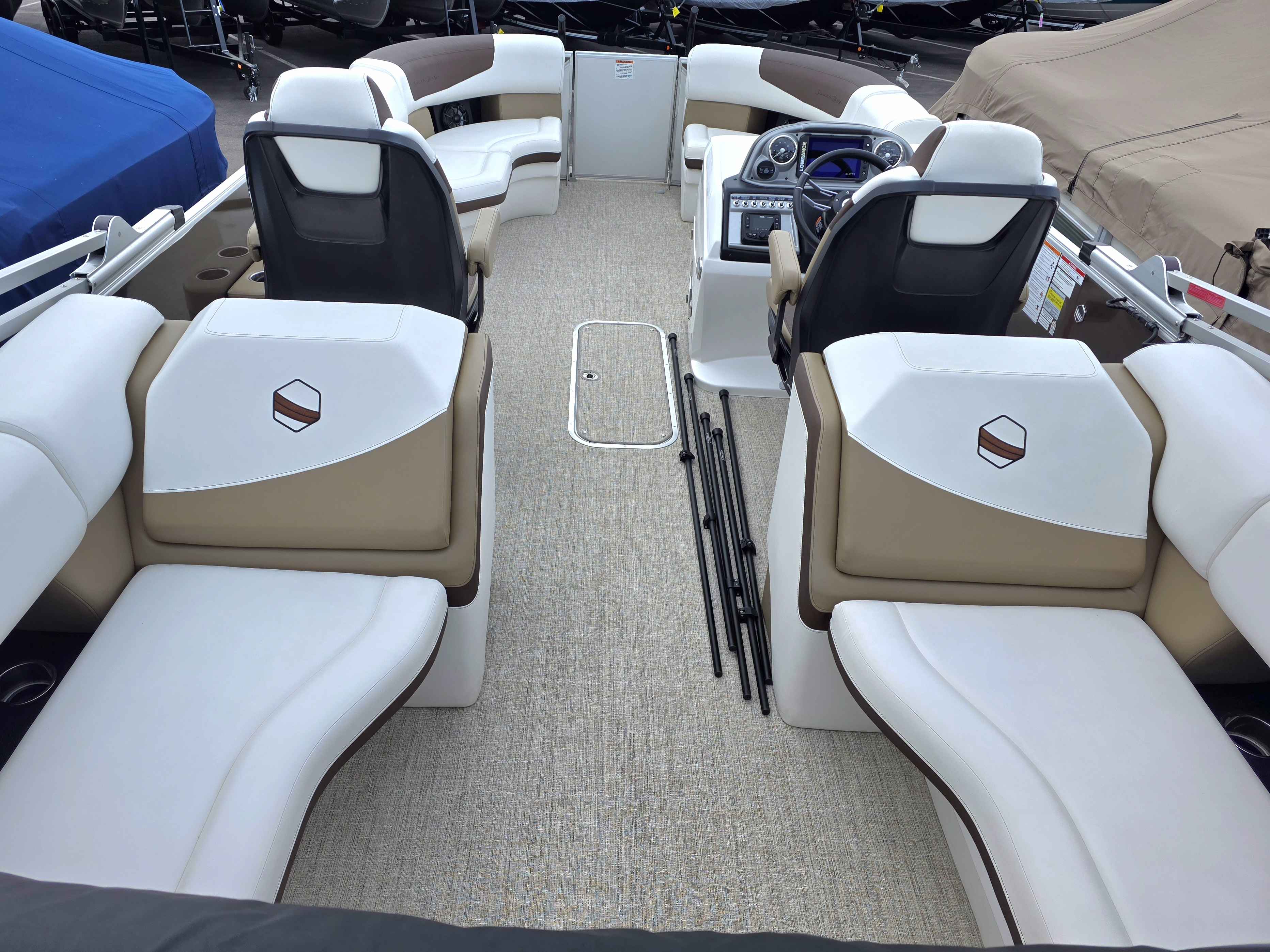 Exterior: Bronze and White, Interior: White and Tan, Tan Flooring, Mercury 159HP Outboard Engine, Lowrance Elite 7 GPS Console, Cover, Trailer, Table, Ski Tow Bar, and many more specs!